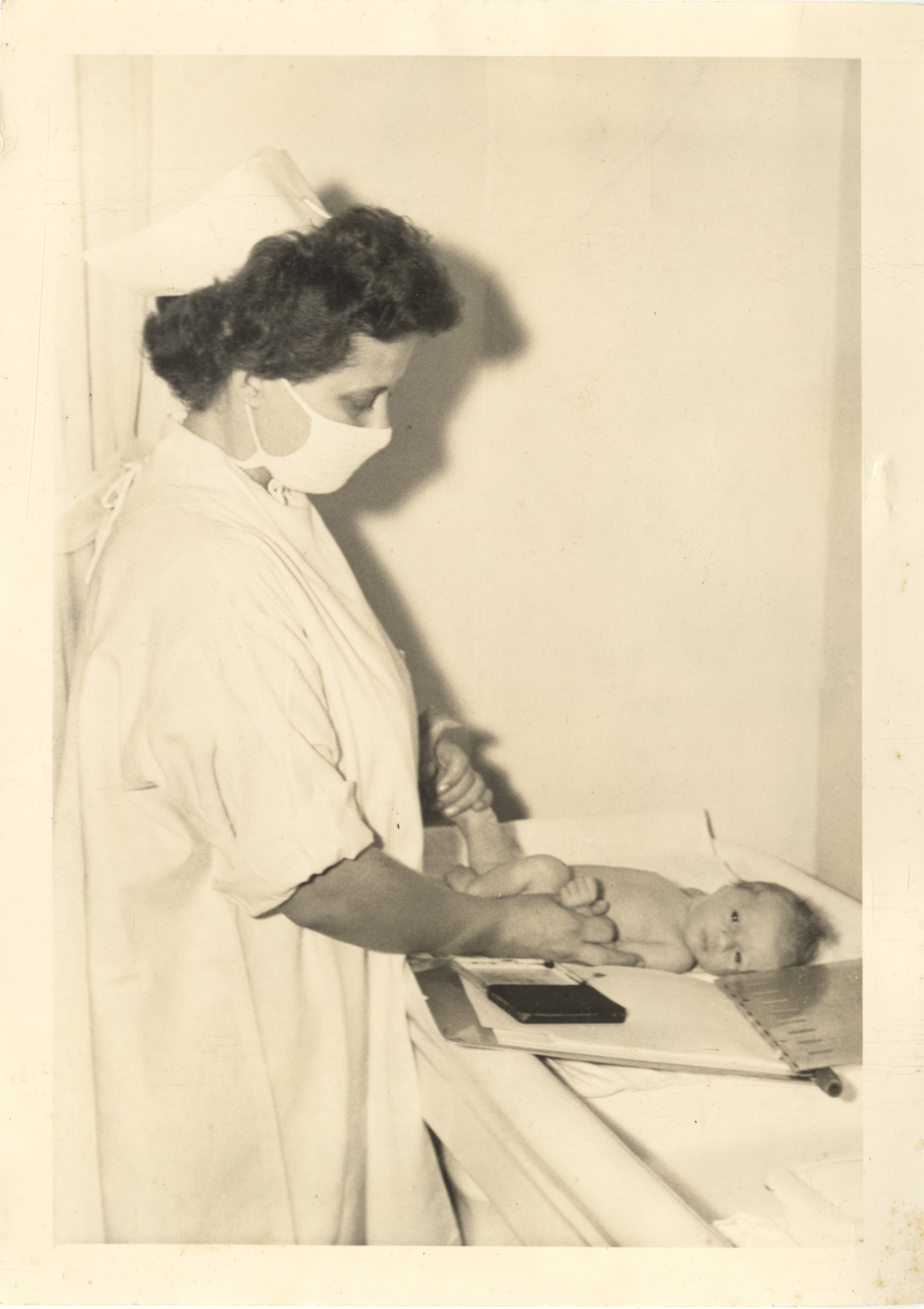 - Black and white photo image of a nurse with a newborn baby at the Portsmouth General Hospital. Nurse looks to be attempting to stamp the baby's foot print onto a page.
