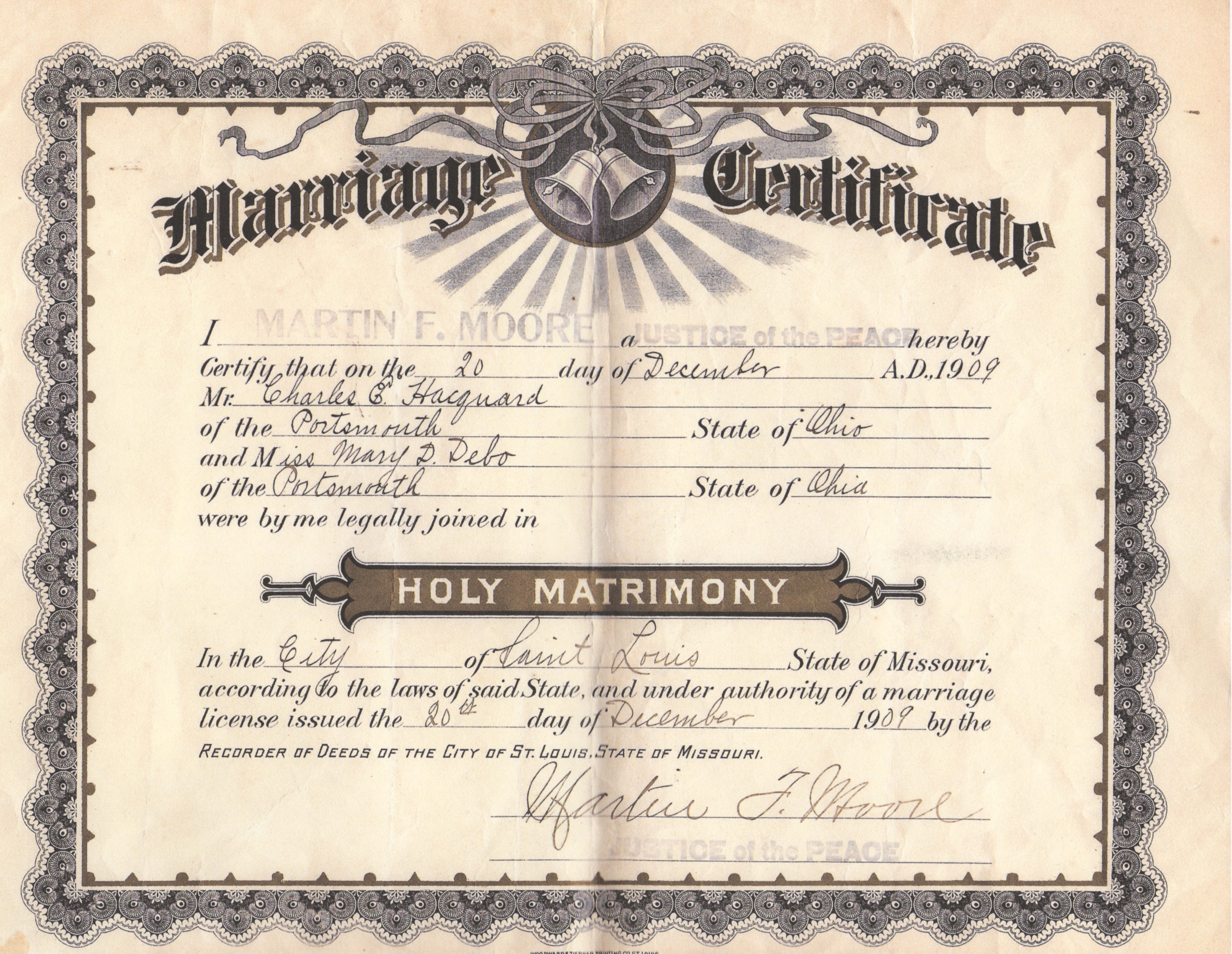 - Black, tan, and brown photocopy of marriage certificate for Charles E Hacquard and Mary Debo.