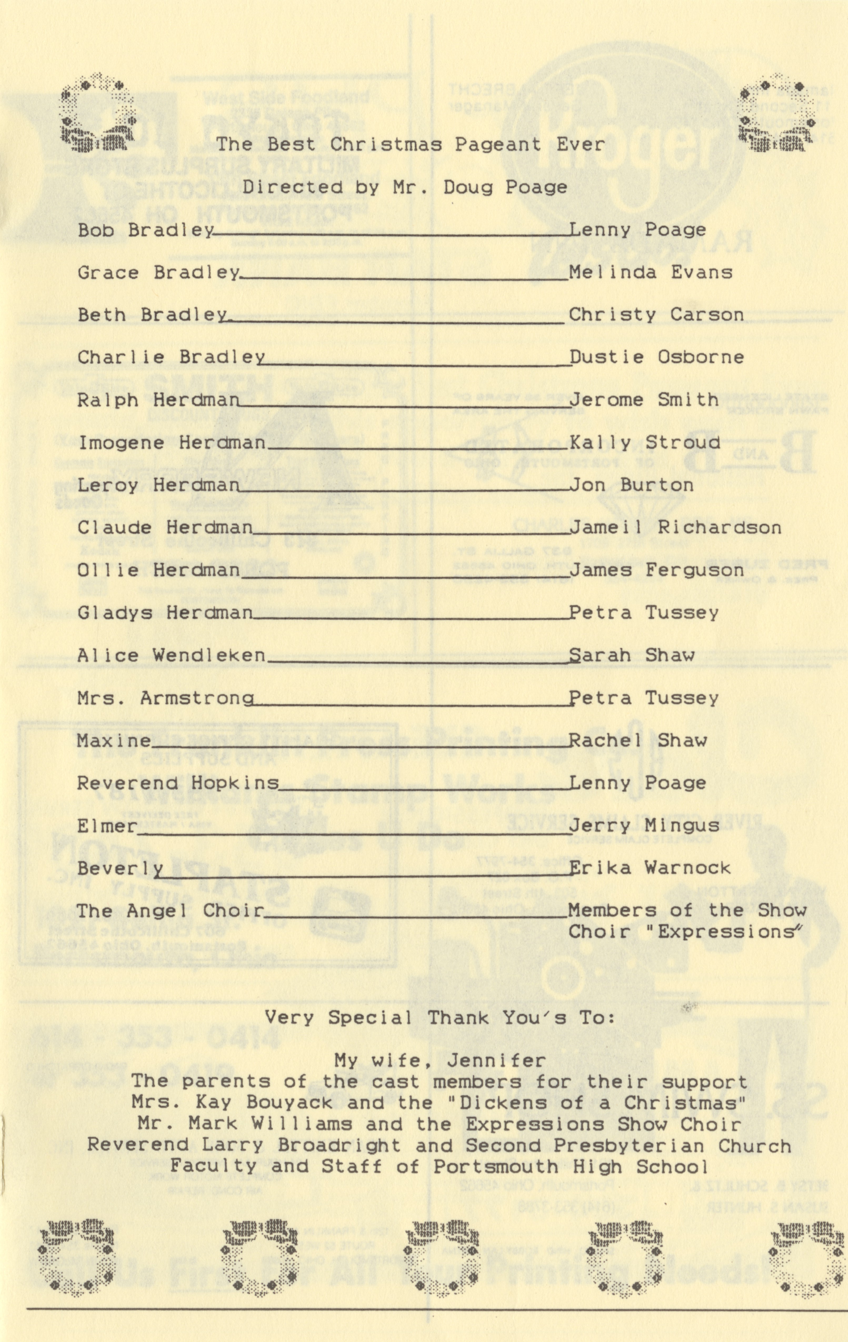- "The Best Christmas Pageant Ever" Revelers Club Play Program December 1991.