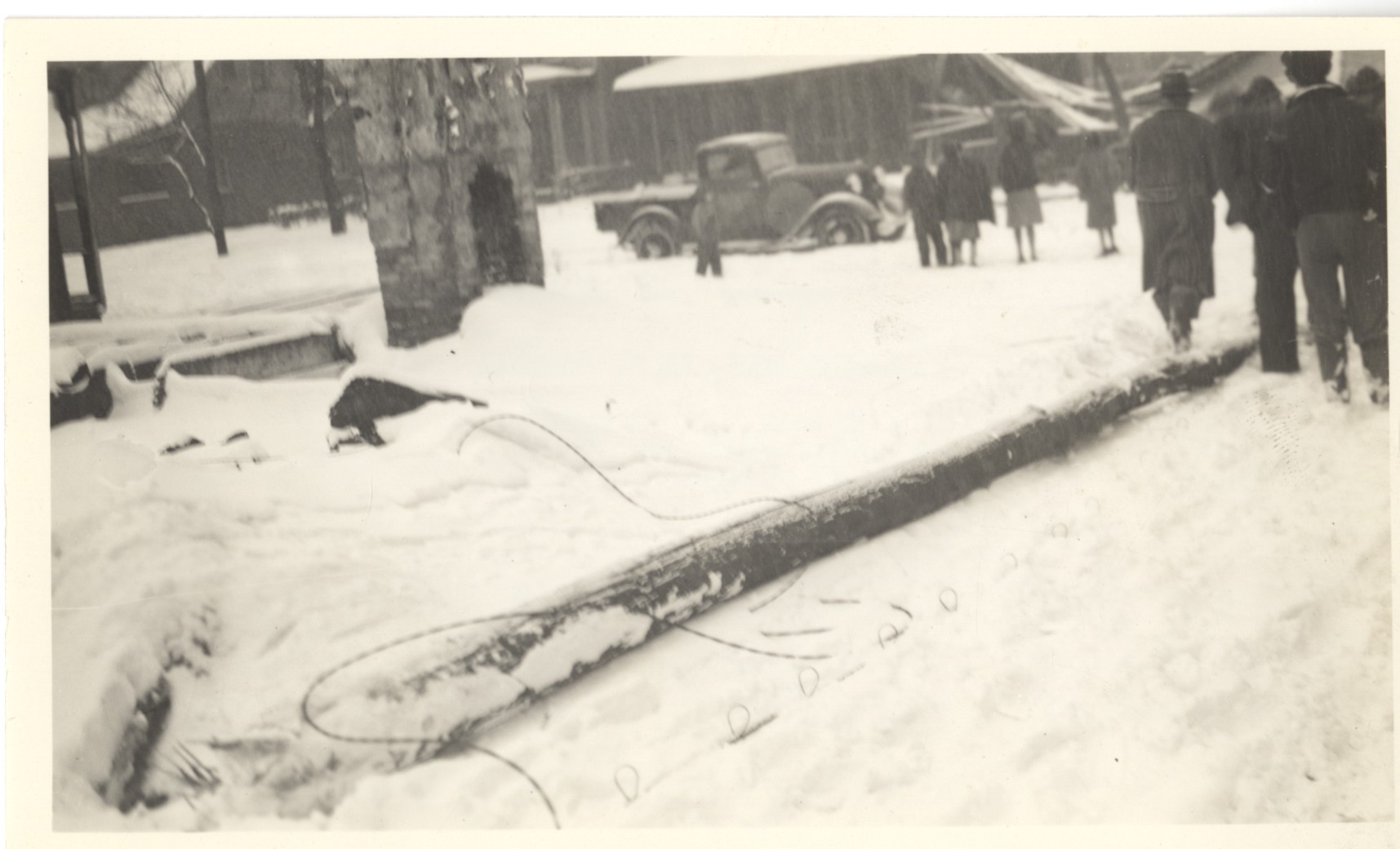 - Black and white photo image of the property of Mrs. Oscar Boyer on Fourteenth (14th) Street, east of Waller. North side showing a pole down in alley, the result of the building on south side of the street collapsing.