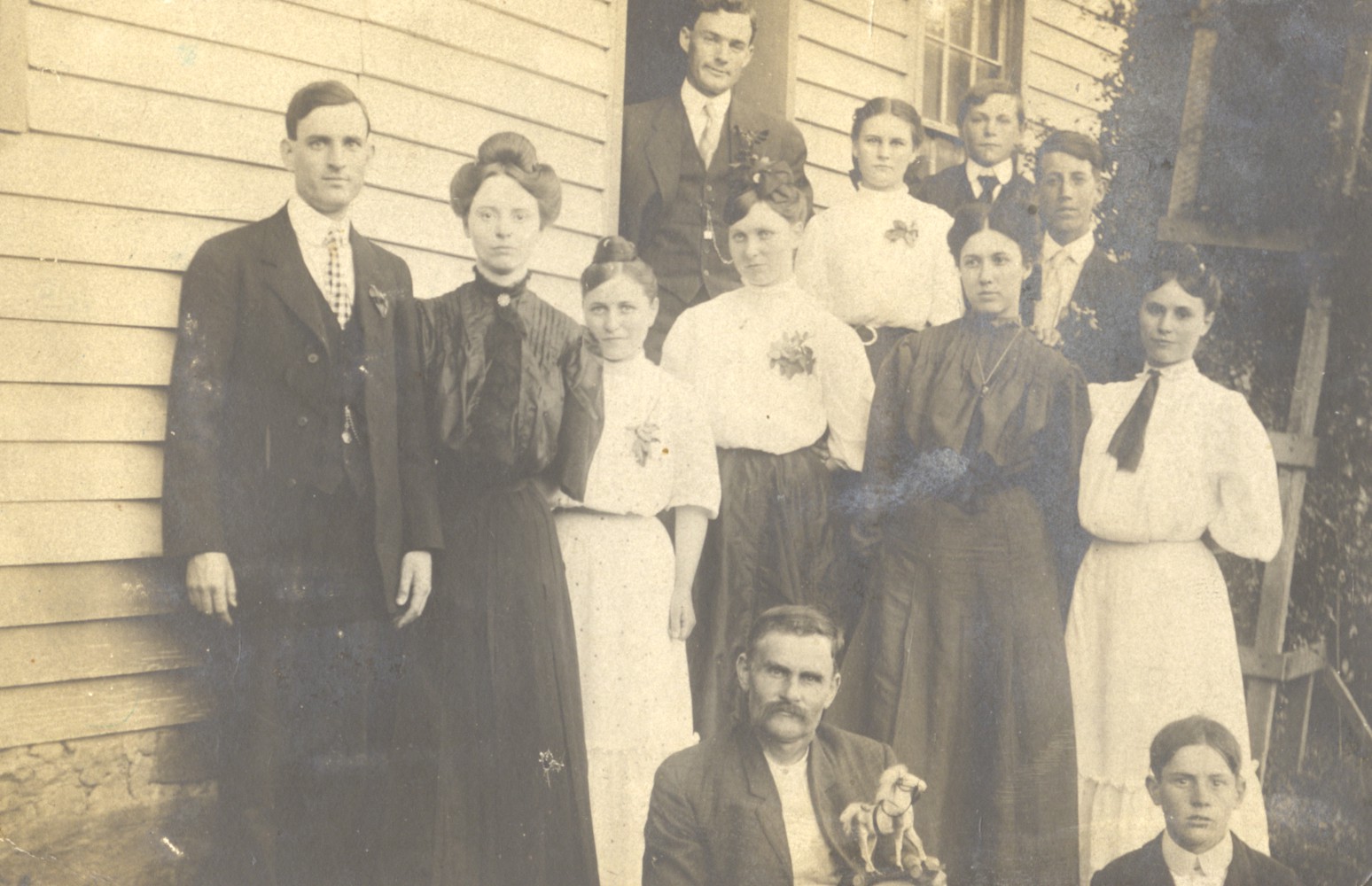 - Black and white photo of a group of people with their last names only written on the back: Lowe, Runyons, Runyons, Runyons, Murphy, Charles, Runyons, Toler, Varney, Runyons, Runyons.