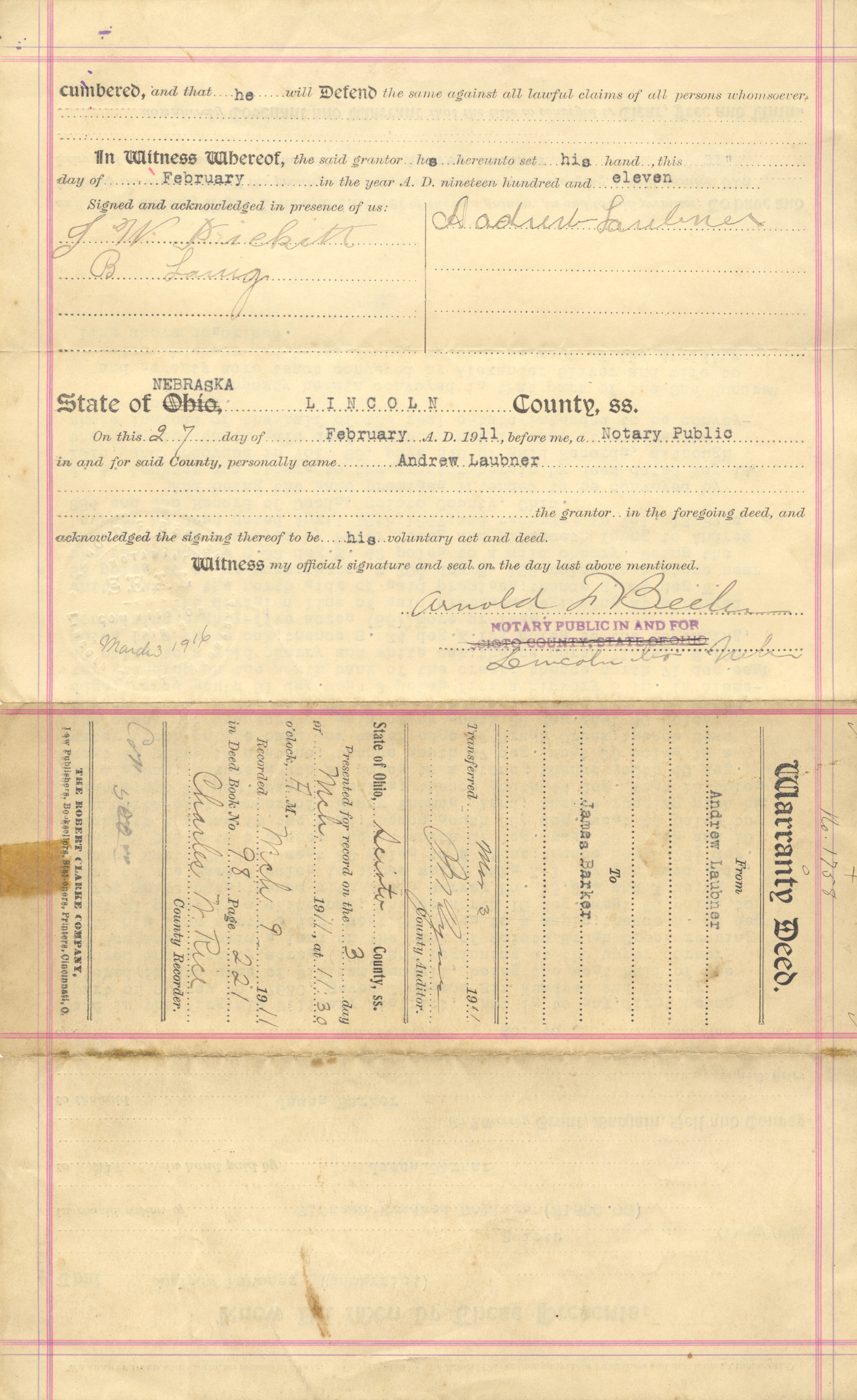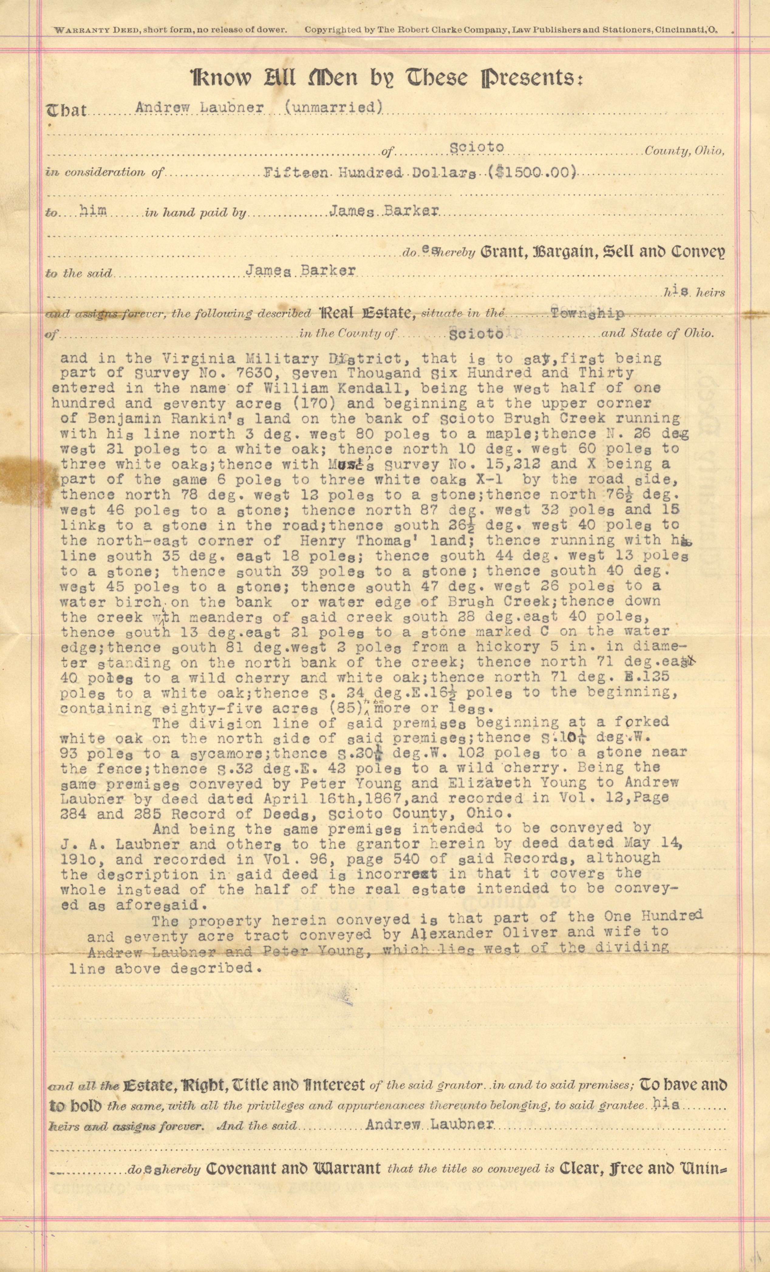 - Aged, off-white paper with black calligraphy with typewritten information on land transfer from Andrew Laubner to James Barker in Brush Creek, Scioto Co. Signed by both parties and notarized in Clarke County, Nebraska. Other names: William Kendall, Benj. Rankin, Henry Thomas, Peter Young, Elizabeth Young, and Alexander Oliver.