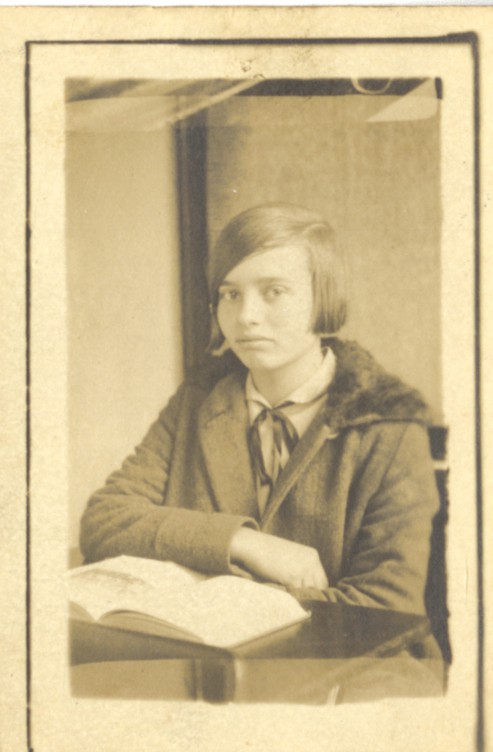 - Black and white photo image of an unknown member of the Charles family. Pictured: girl at a desk with a book. in uniform. Single line frames photo.