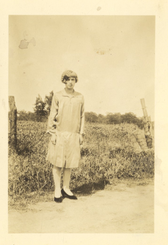 - Black and white photo image of an unknown girl, a relation to Fred Charles. Girl is standing in front of a field of grass, wearing a dress and tights.