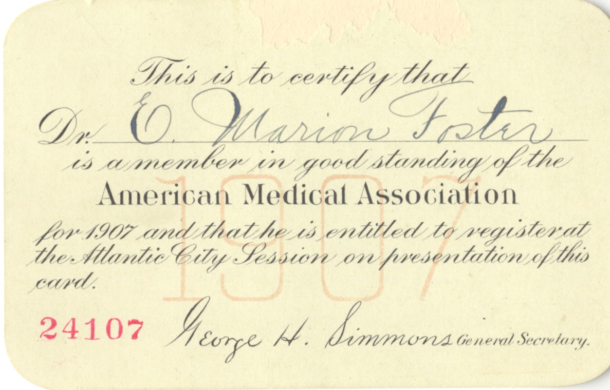 - off-white card with black script, ink handwriting, red numbers in lower left corner, and faded "1907." Behind print: This is a Medical Association (AMA) Card for Ezekiel M. Foster.