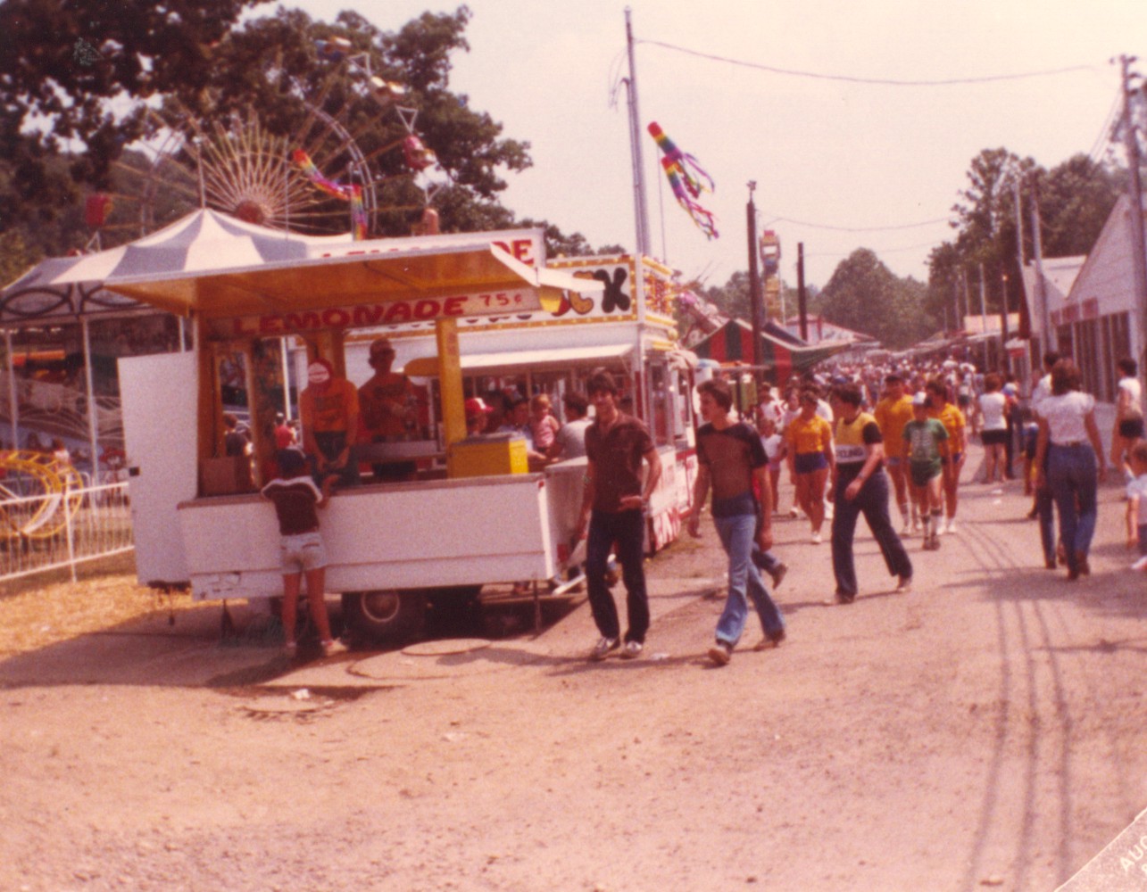- color photo of a lemonade stand at the fair along with fairgoers.