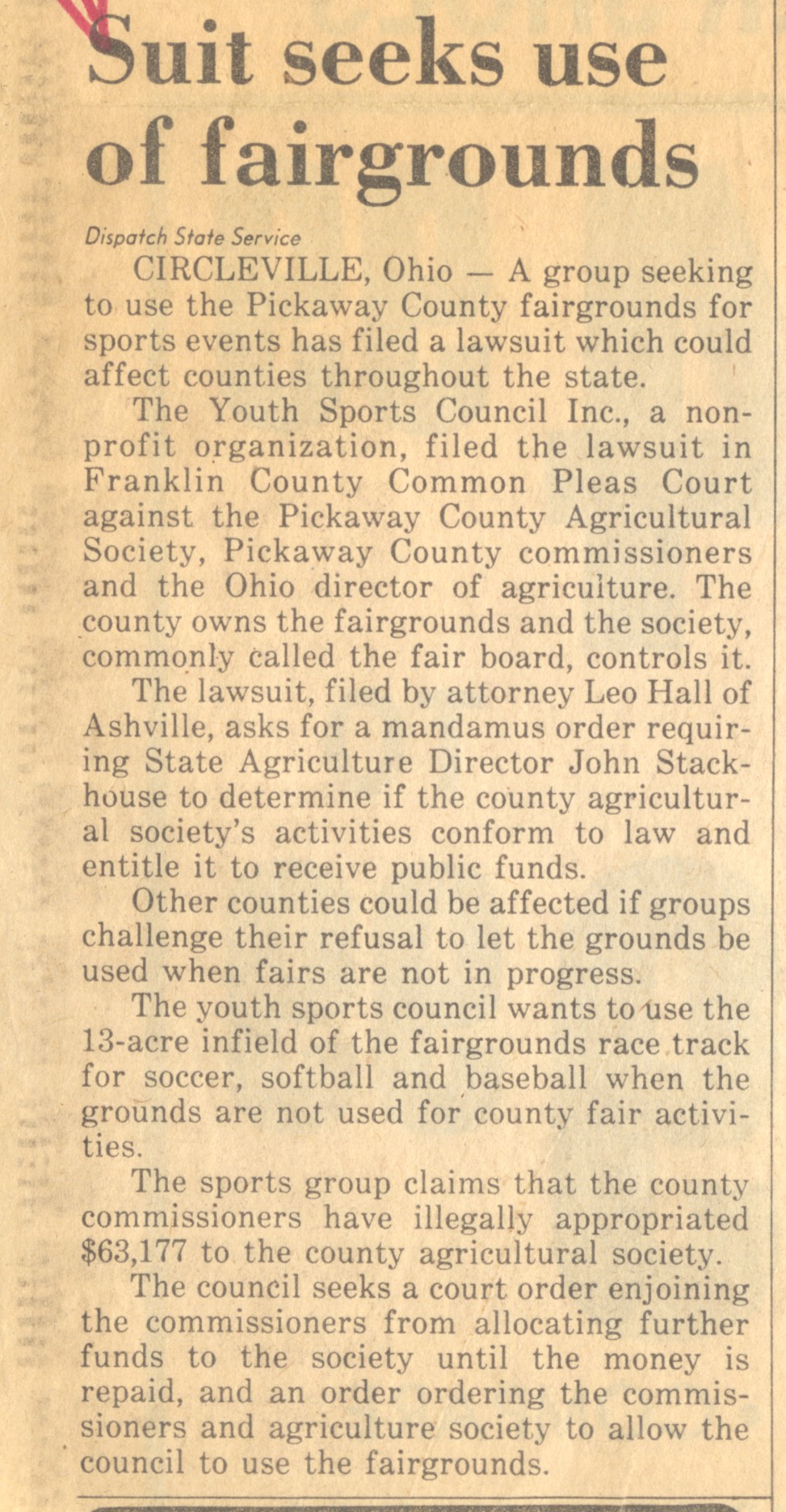 - scan of newspaper article from Circleville detailing how a local group was suing the Pickaway County Fairgrounds.