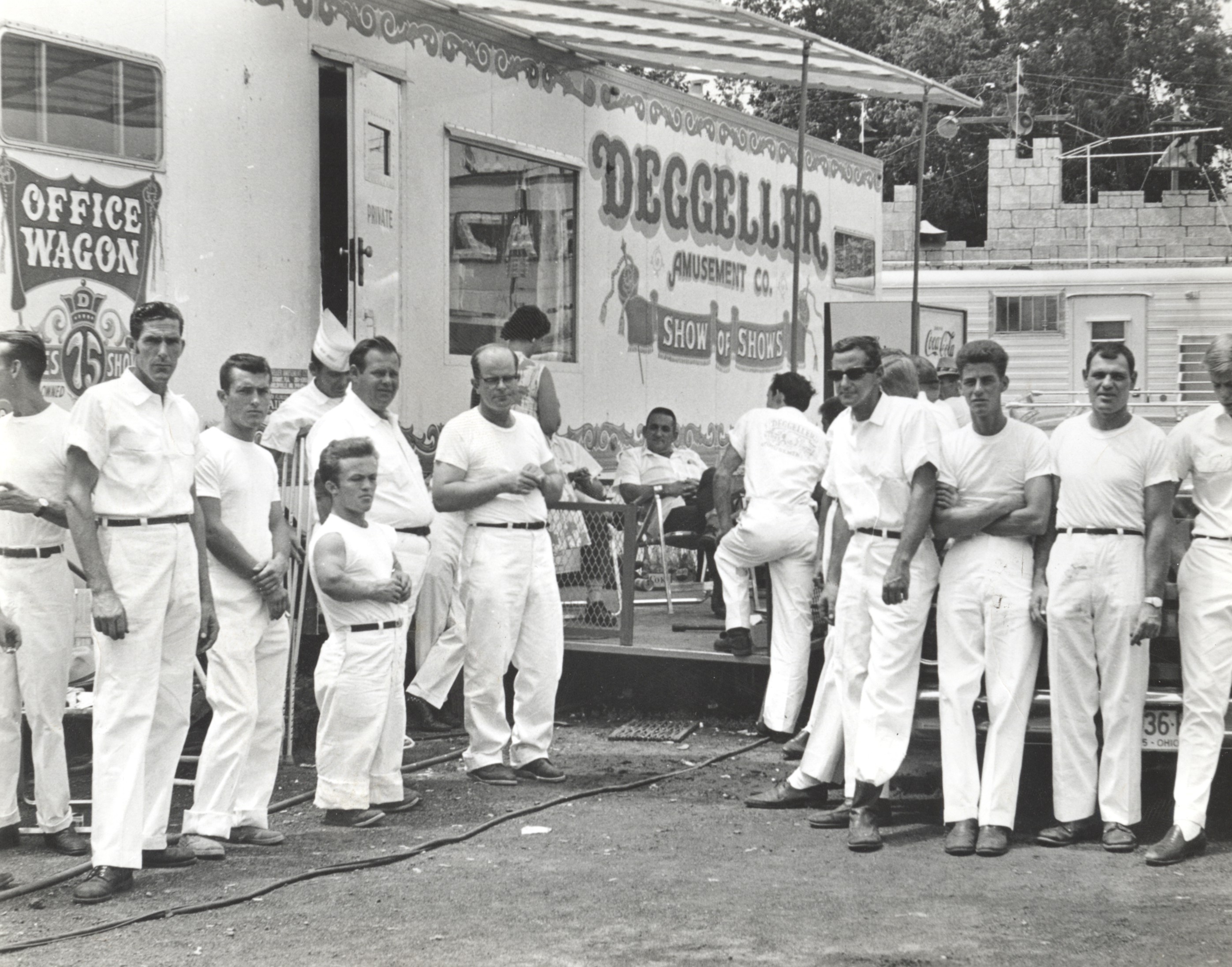 - scan of black and white photo of members of the Deggeller Amusement Company at the Scioto County Fair.