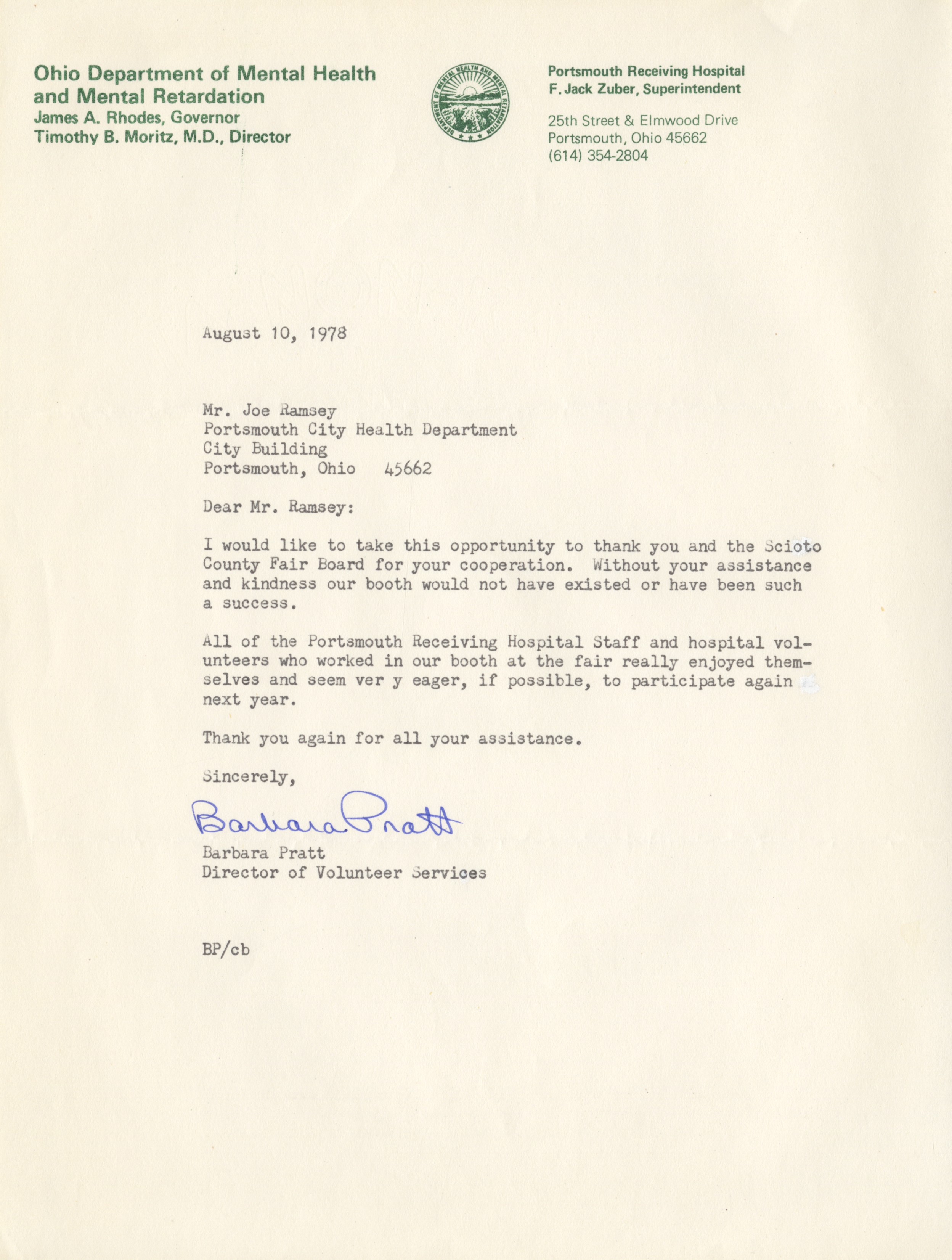 - scan of letter addressed to Joseph Ramsey from Barbara Pratt, Director of Volunteer Services for the Ohio Department of Mental Health and Mental Retardation. Letter thanks the Scioto County Fair Board for their cooperation and assistance.