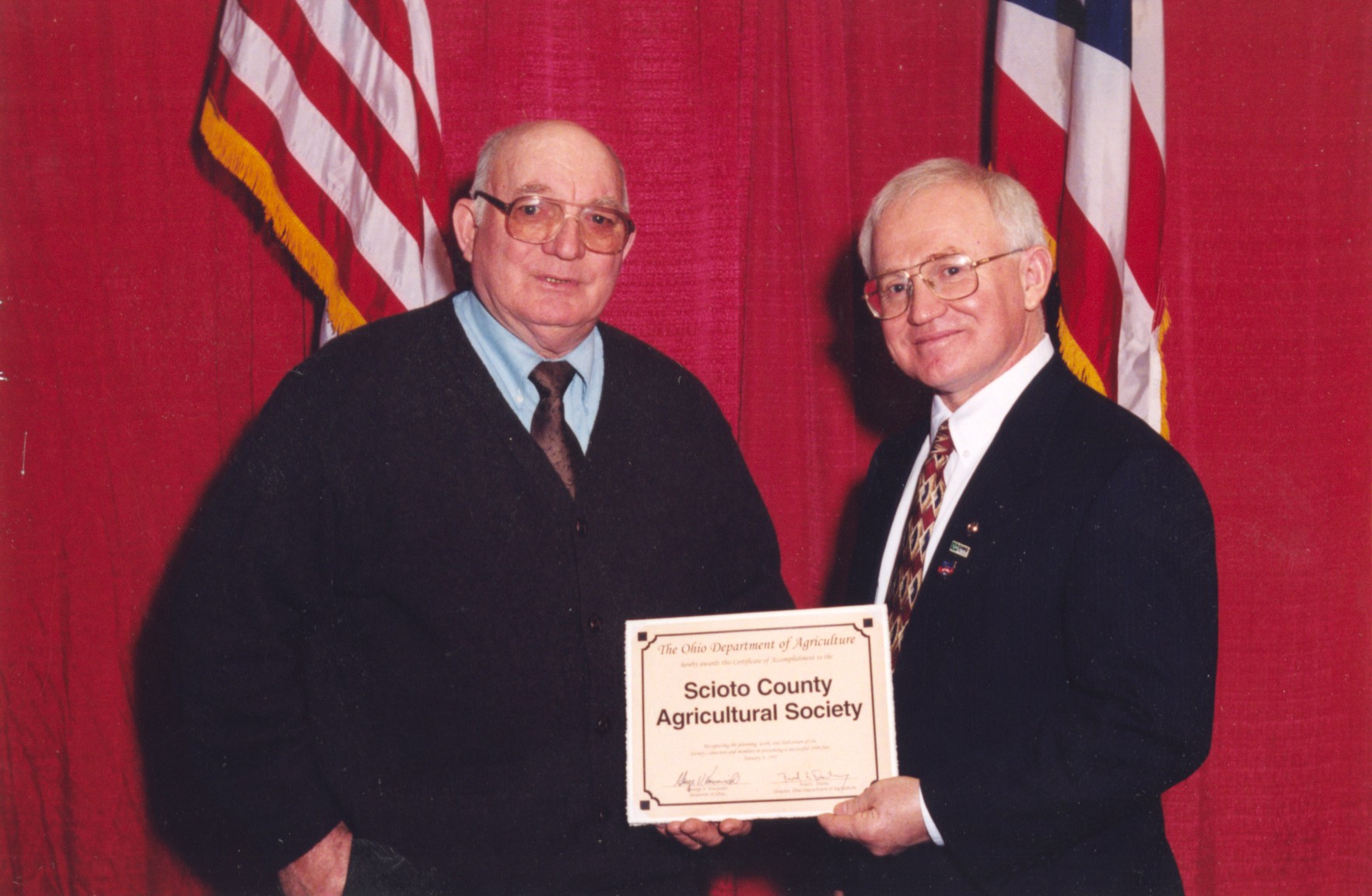 - scan of color photo of the reception of a certificate of accomplishment to the Scioto County Agricultural Society from the Ohio Department of Agriculture. Pictured: (L) Joseph Ramsey.