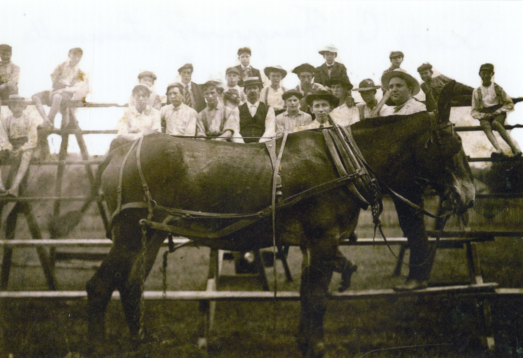 - scan of black and white photo of a fair scene from 1945. In the picture, a group of men sit in stands and watch a donkey, presumably doing something that has to do with farming.