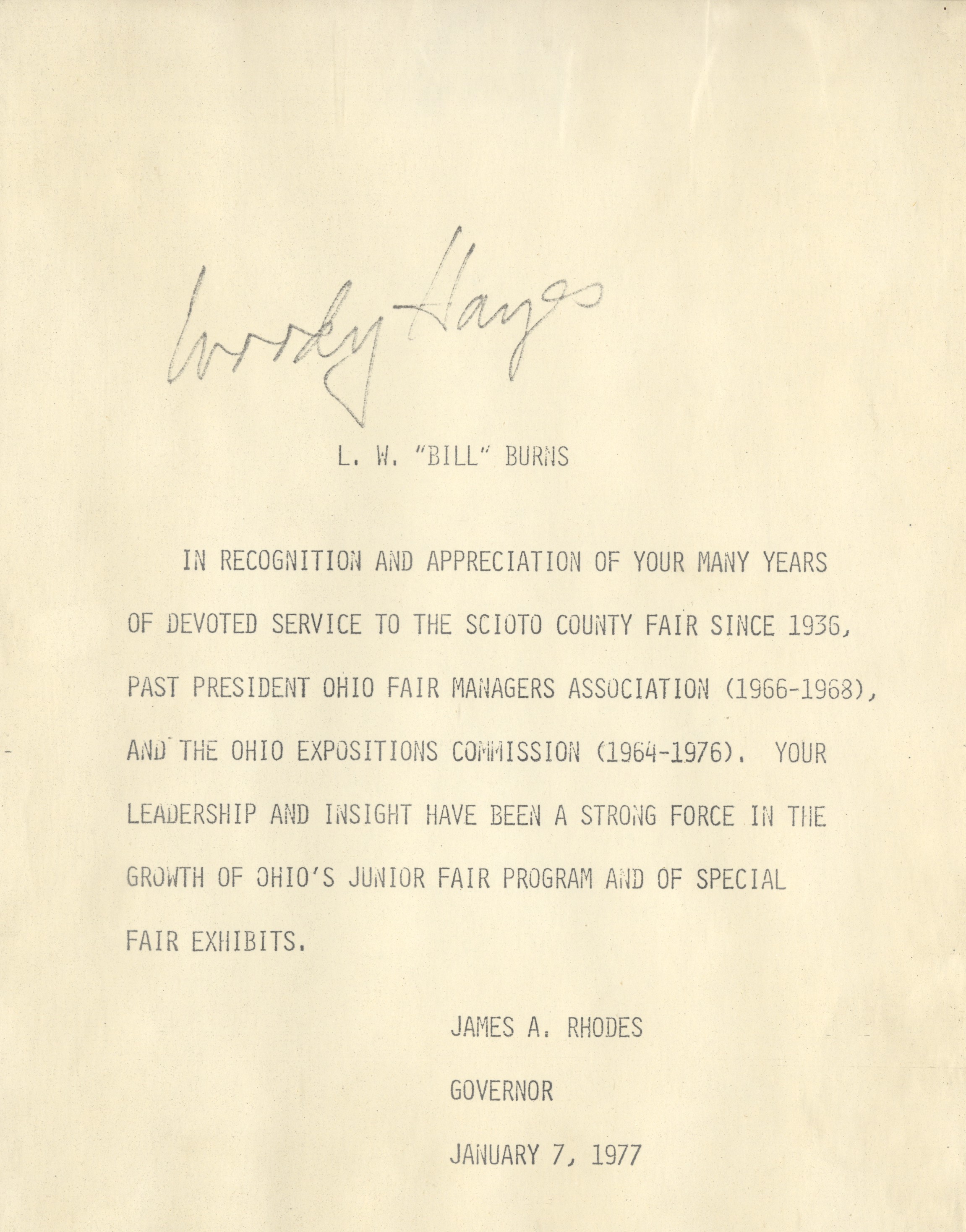 - scan of a typed letter addressed to L. W. Burns from Ohio Governor James A. Rhodes. Letter is dated January 7, 1977 and contains a recognition and appreciation for Burns' service to the Scioto County Fair from 1936-1976.