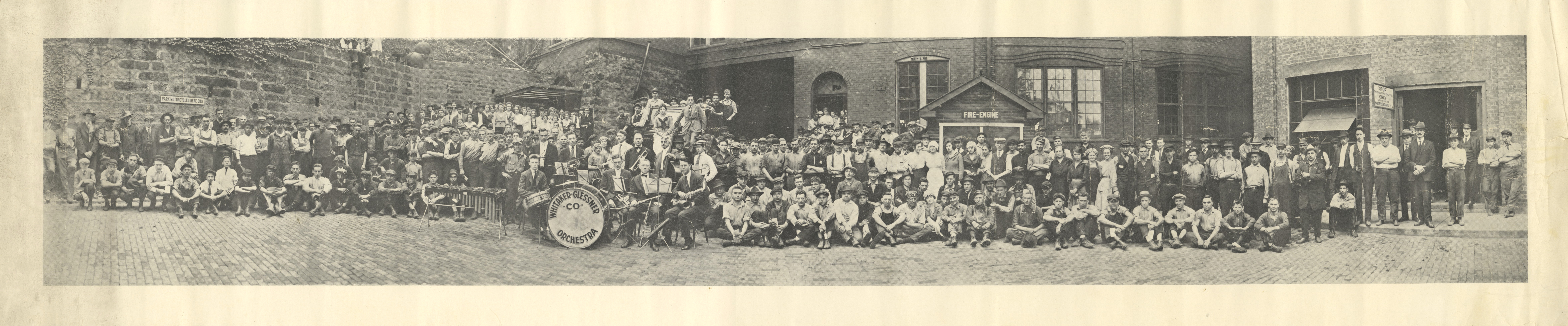 - black and white copy of a group photo of the employees of Whittaker-Glessner Co. and members of their orchestra.
