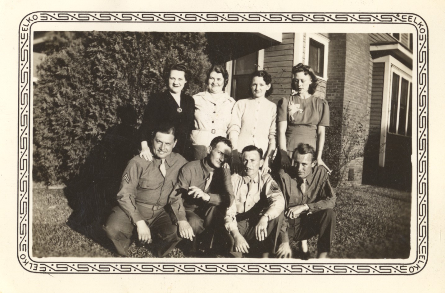 - Black and white photo image of a group. On back: Ruth Abramsky, Marguerite Hutchison, Helen Hopper, Kitty Nelles, Irving Abramsky, H. E., Ed Hopper-Technical Sergeant, John Nelles- Master Sergeant (Old Goat #2).