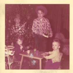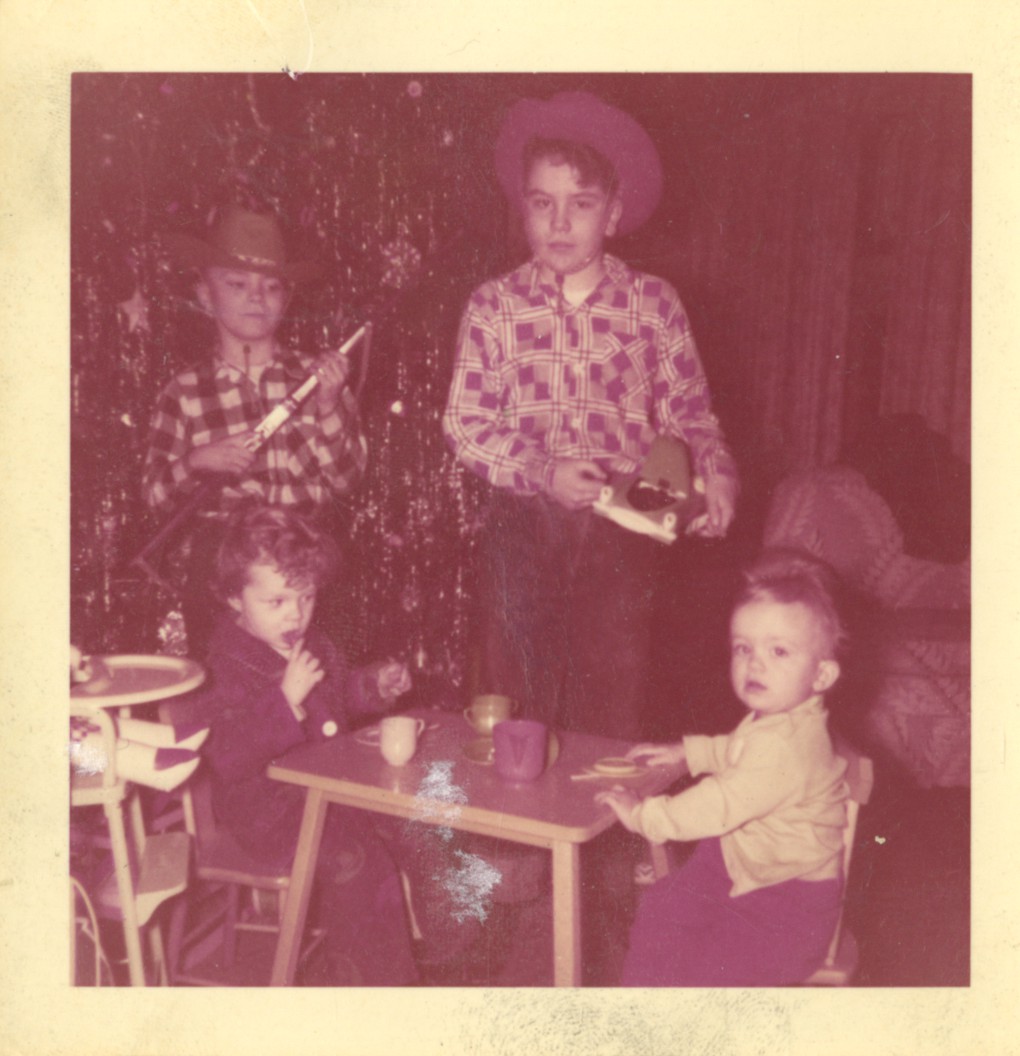 - Red-color photo image of the Hartnett children. On back: "Jerry, 8. Ken, 9. Terry 2 1/2. Linda, 1."