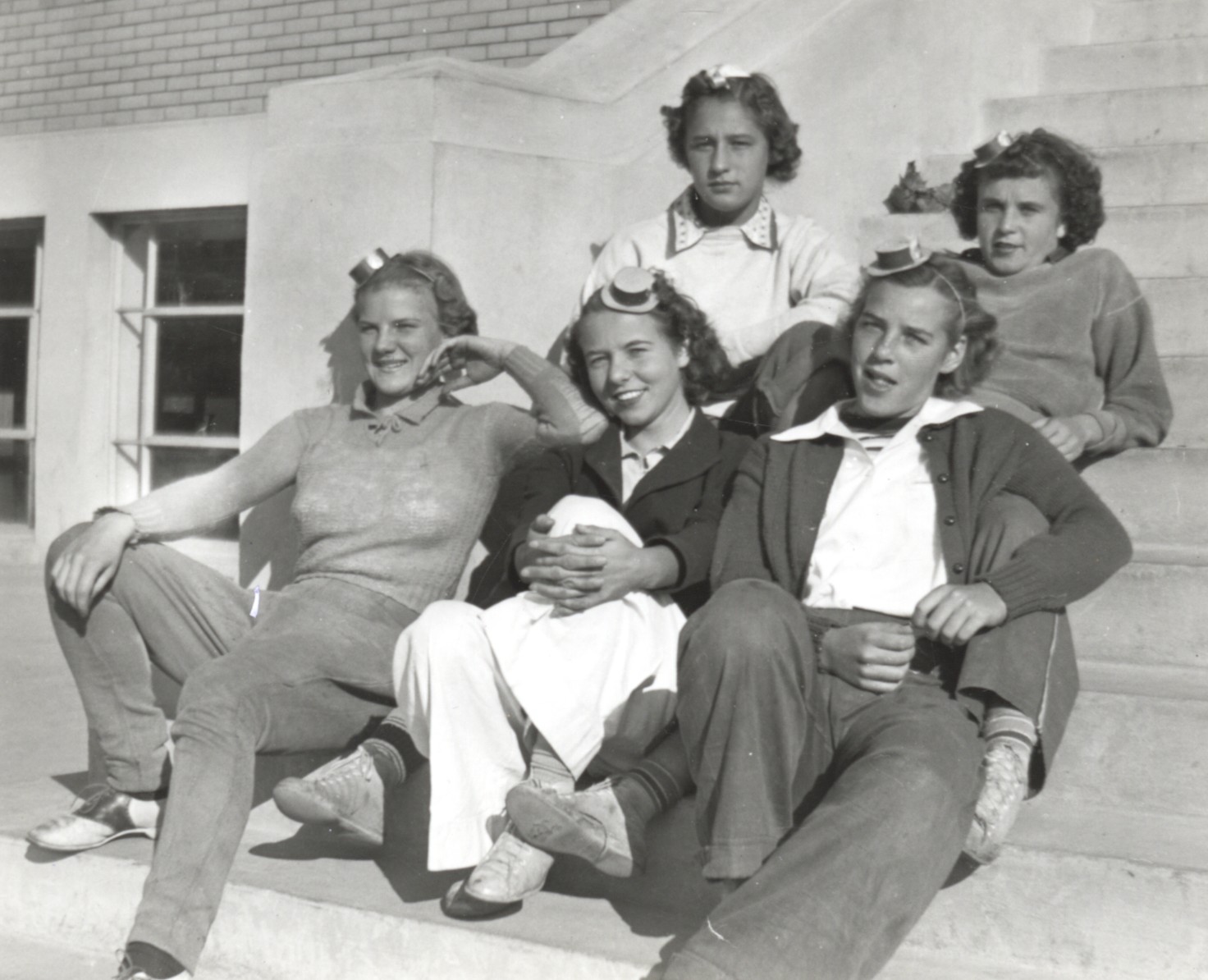- Black and white copy of photo image of 5 ladies seated on the front steps of the building. Identified as: Bottom row ( l to r) Jackie Frecka, 1940; Jeanette Snyder, 1941, Jane Walbright, 1941. Top row, Rita Martin, 1942 and Virginia "Gin" Snyder, 1940. (copy made by Shannon Snyder-Millhuff)