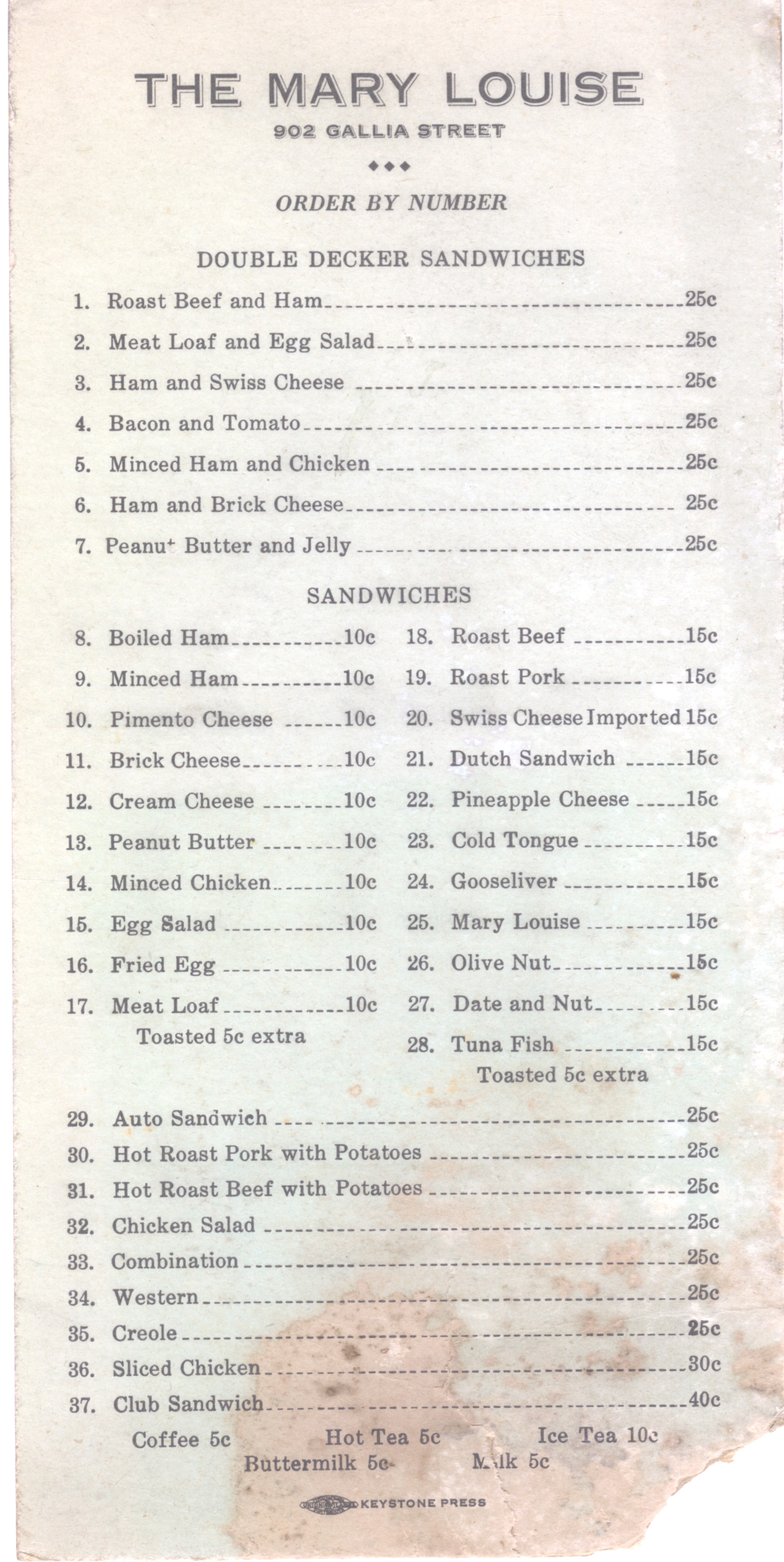 - Faded green card-like paper with menu food and prices. Some water damage and lower right corner tor. Located - 902 Gallia. Mary Louise Lewis started the business in 1919 at first location on 5th Street. 902 Gallia opened in 1931.