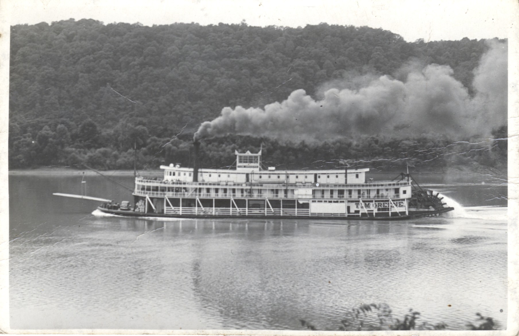 - Black and white photo of the Tom Greene steamboat on the Ohio River at Portsmouth, Ohio. Kentucky hills shown in background.