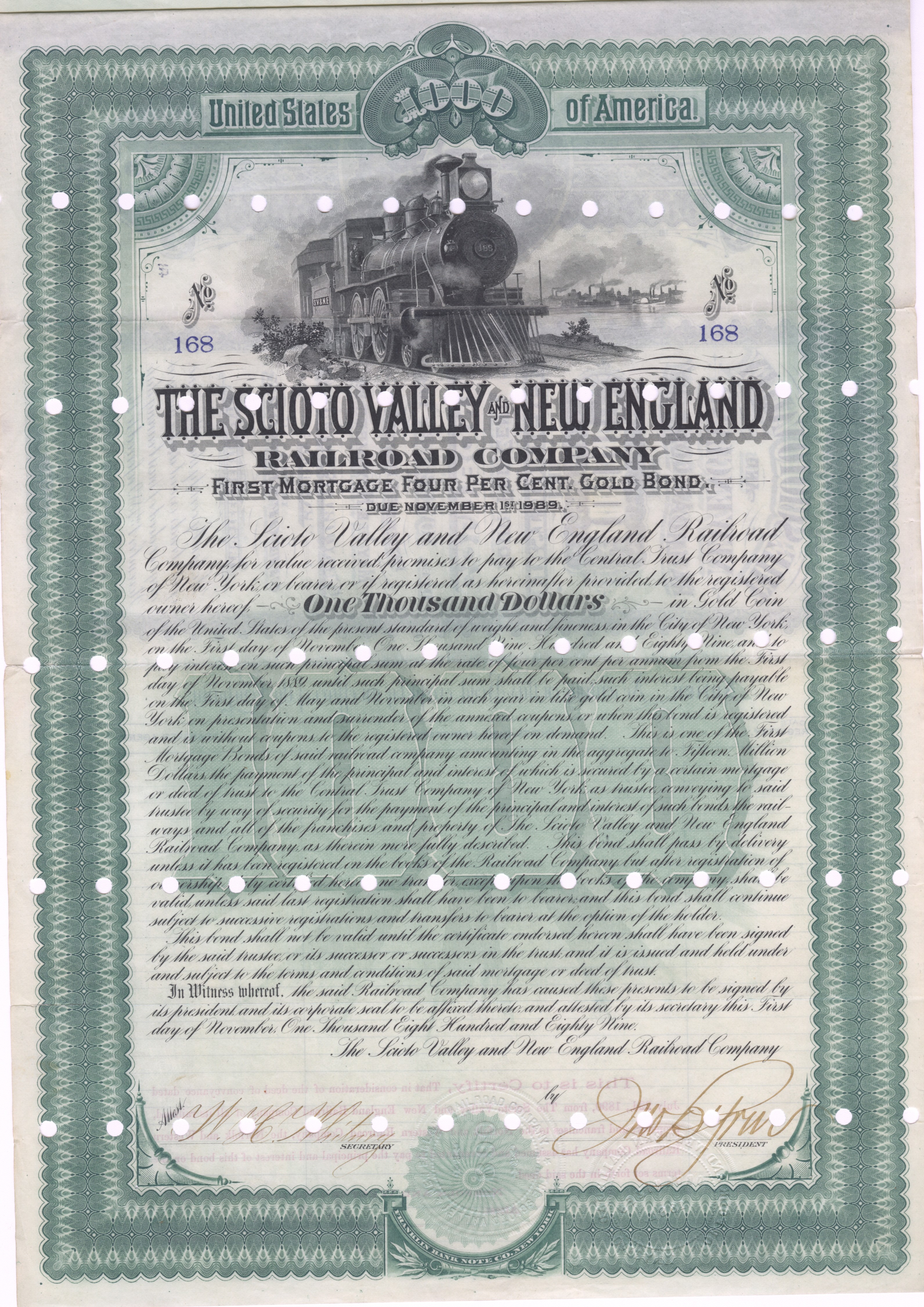 Franklin Banknote Company, “The Scioto Valley and New England Railroad Company,” Scioto County Public Library Local History Digital Collection, accessed December 6, 2025, https://www.sciotolibrary.org/history/items/show/29556.