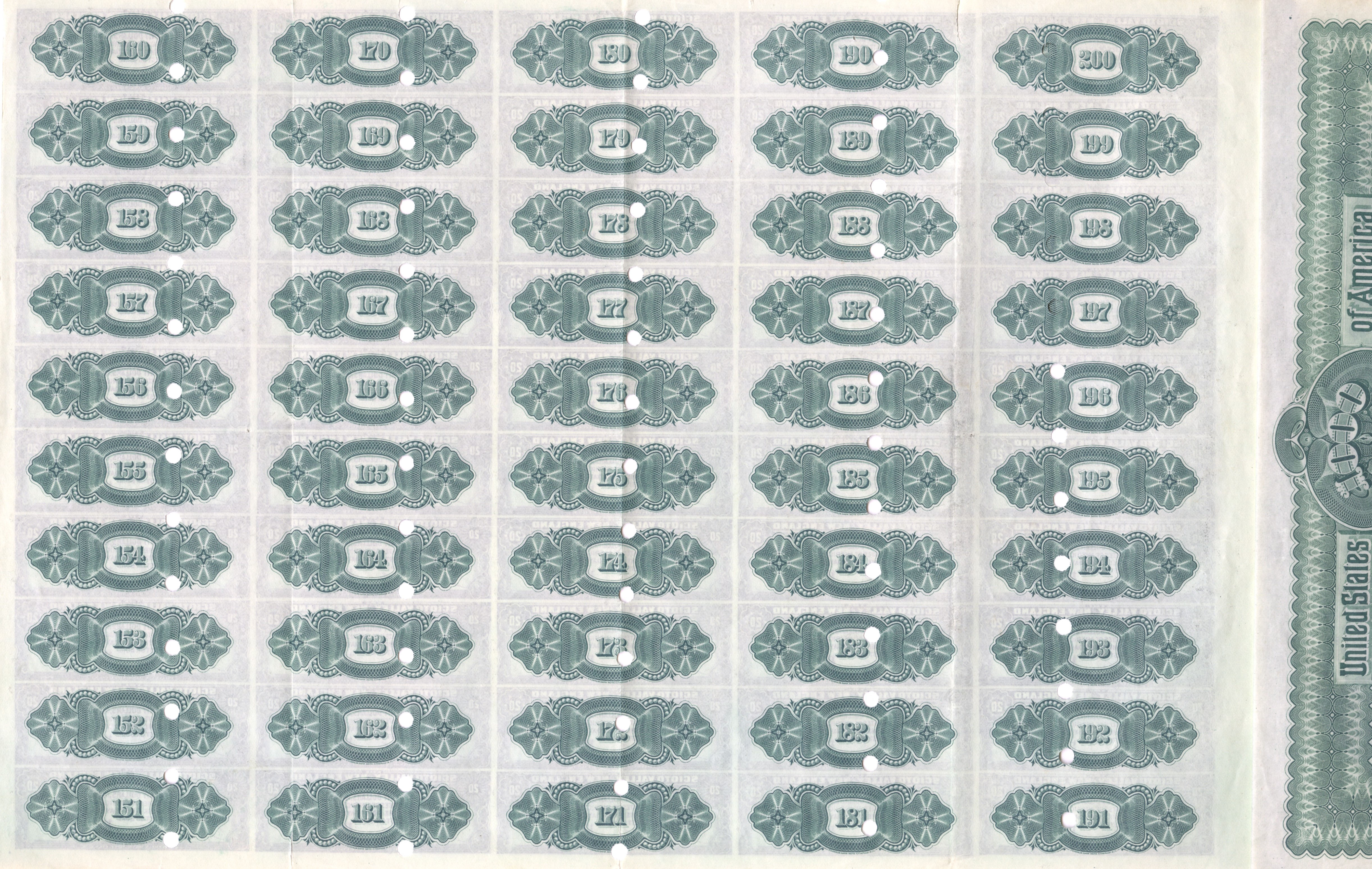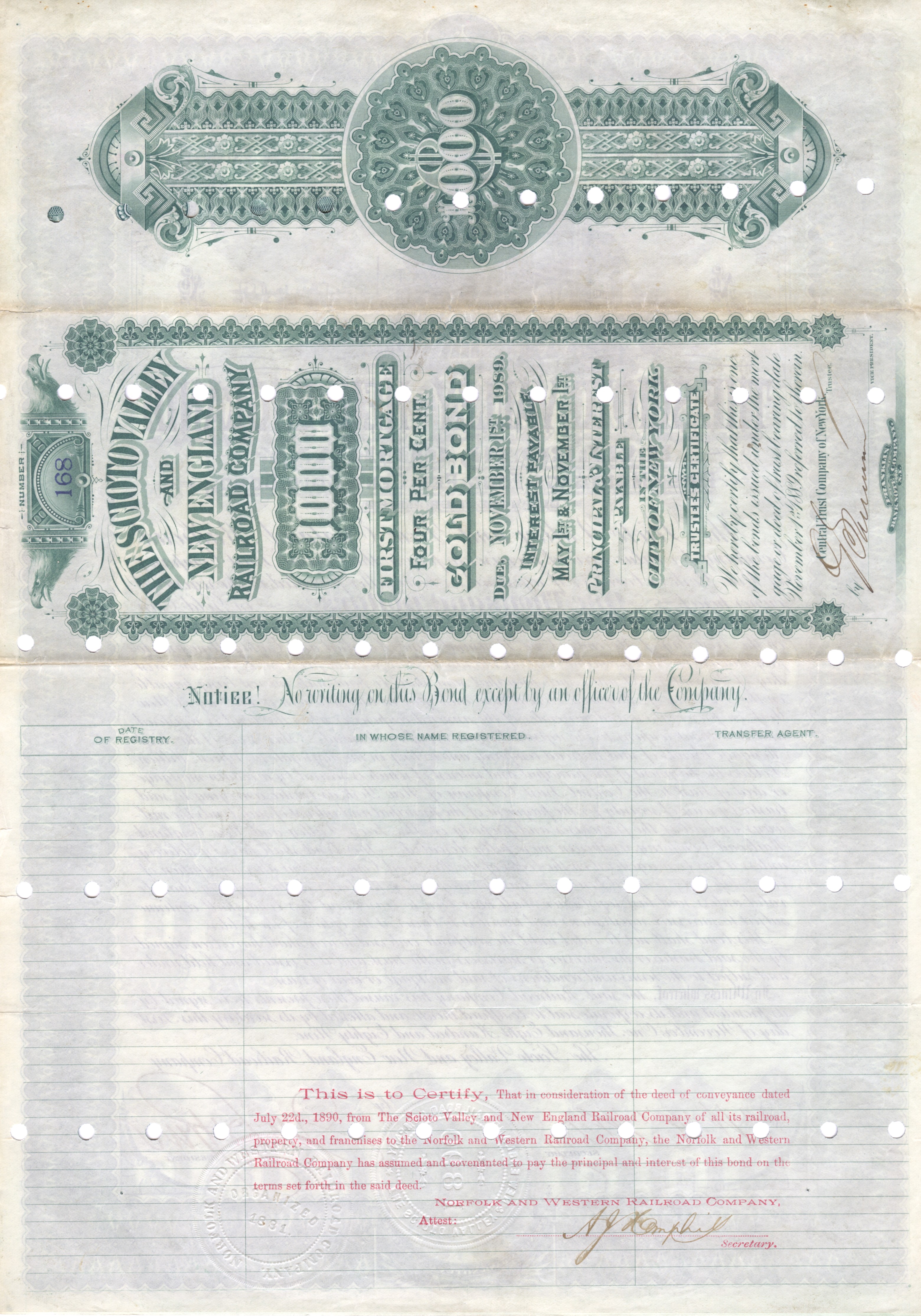 - Off white with green print and scroll work gold bond certificate. Folded paper with perforated stamps on inside. Numbered as "168" deed of conveyance to N&W on back. Contract mortgage inside.
