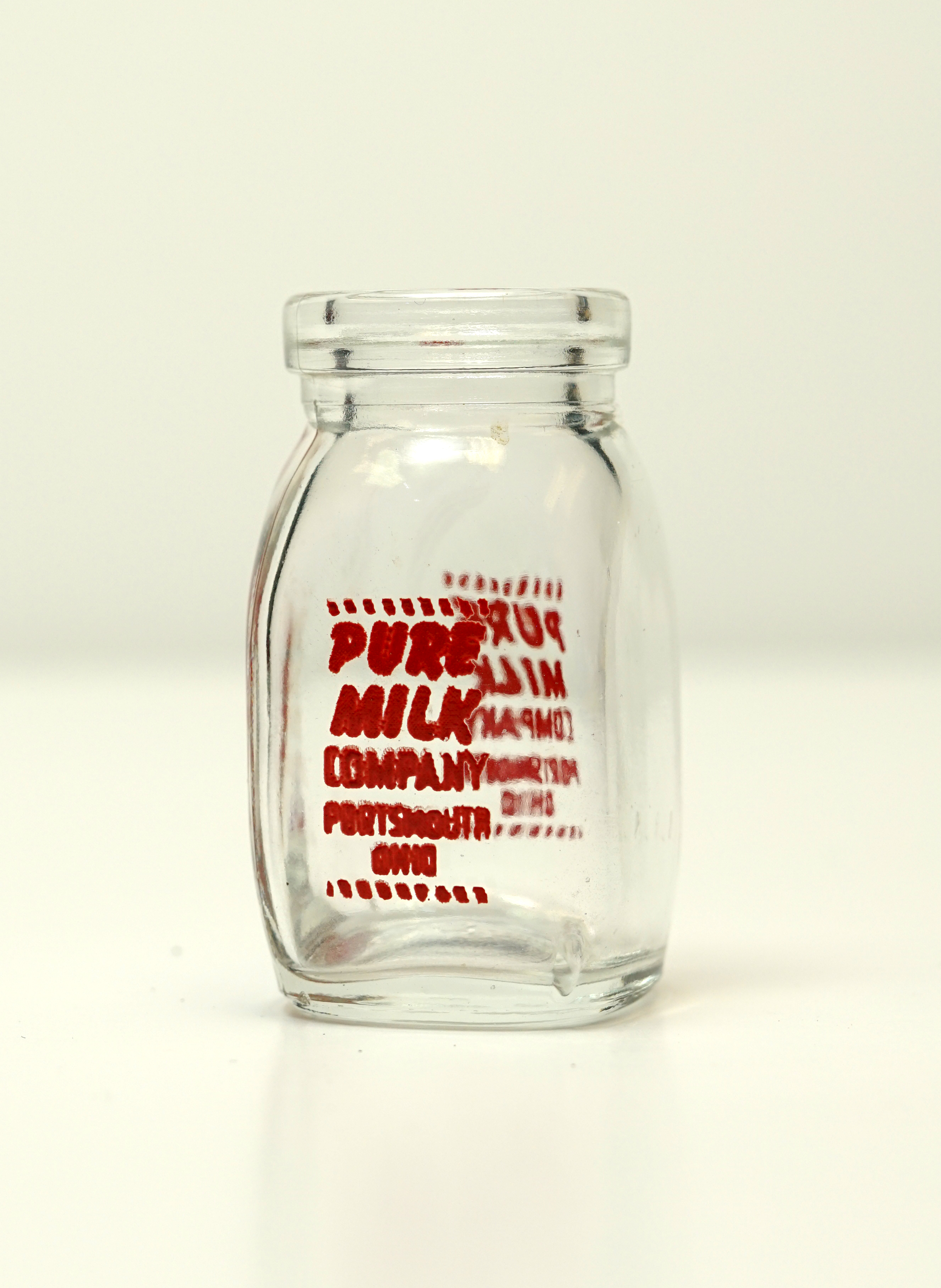 - Glass bottle with red print, "Pure Milk Company, Portsmouth, Ohio" on front and back. Small bottle was used for cream. The Pure Milk Company was located on Eighth (8th) Street.