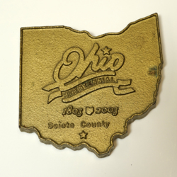 - Gold in color, cast iron trivet in shape of the state of Ohio. Front "Ohio Bicentennial, 1803-2003, County" on Back "Osco Industries, Portsmouth, Ohio"