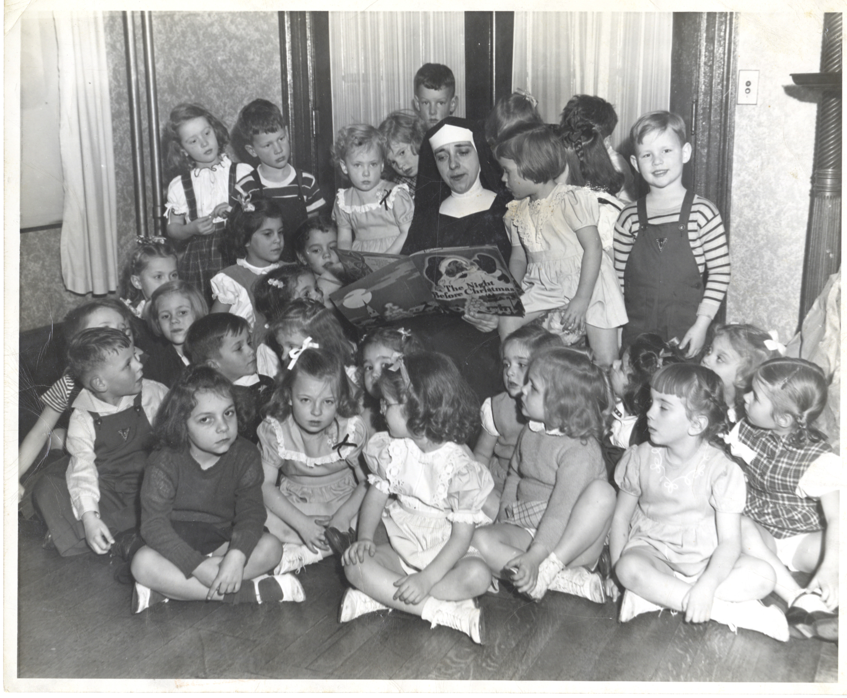 - Black and white photo of kindergarteners from the Conservatory sitting around a woman (Sister Frances Clara) reading them "The Night Before Christmas" in 1946 or 1947. On back says "Christmas 1946 or 1947, Conservatory Kindergarten, Sister Frances Clara"