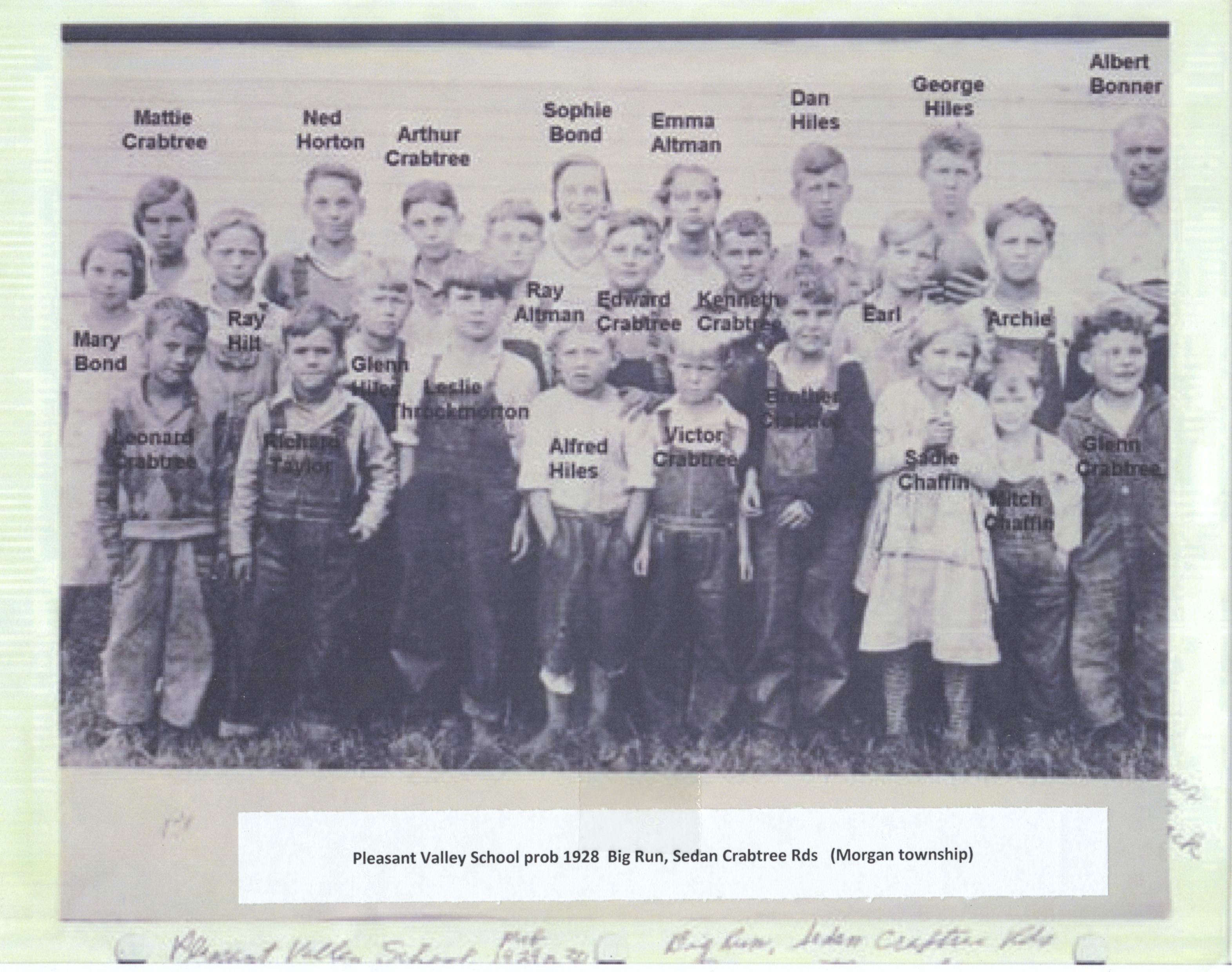 - Black and white photo copy of a Pleasant Valley School class photo circa 1928. Names of students are printed on the picture. Pleasant Valley School was on Big Run, Sedan Crabtree roads in Morgan Township. First row: Leonard Crabtree, Richard Taylor, Leslie Throckmorton, Alfred Hiles, Victor Crabtree, Brother Crabtree, Sadie Chaffin, Mitch Chaffin, Glenn Crabtree. Second row: Mary Bond, Ray Hill, Glenn Hiles, Ray Altman, Edward Crabtree, Kenneth Crabtree, Earl, Archie. Third row: Mattie Crabtree, Ned Horton, Arthur Crabtree, Sophie Bond, Emma Altman, Dan Hiles, George Hiles. Teacher: Albert Bonner.