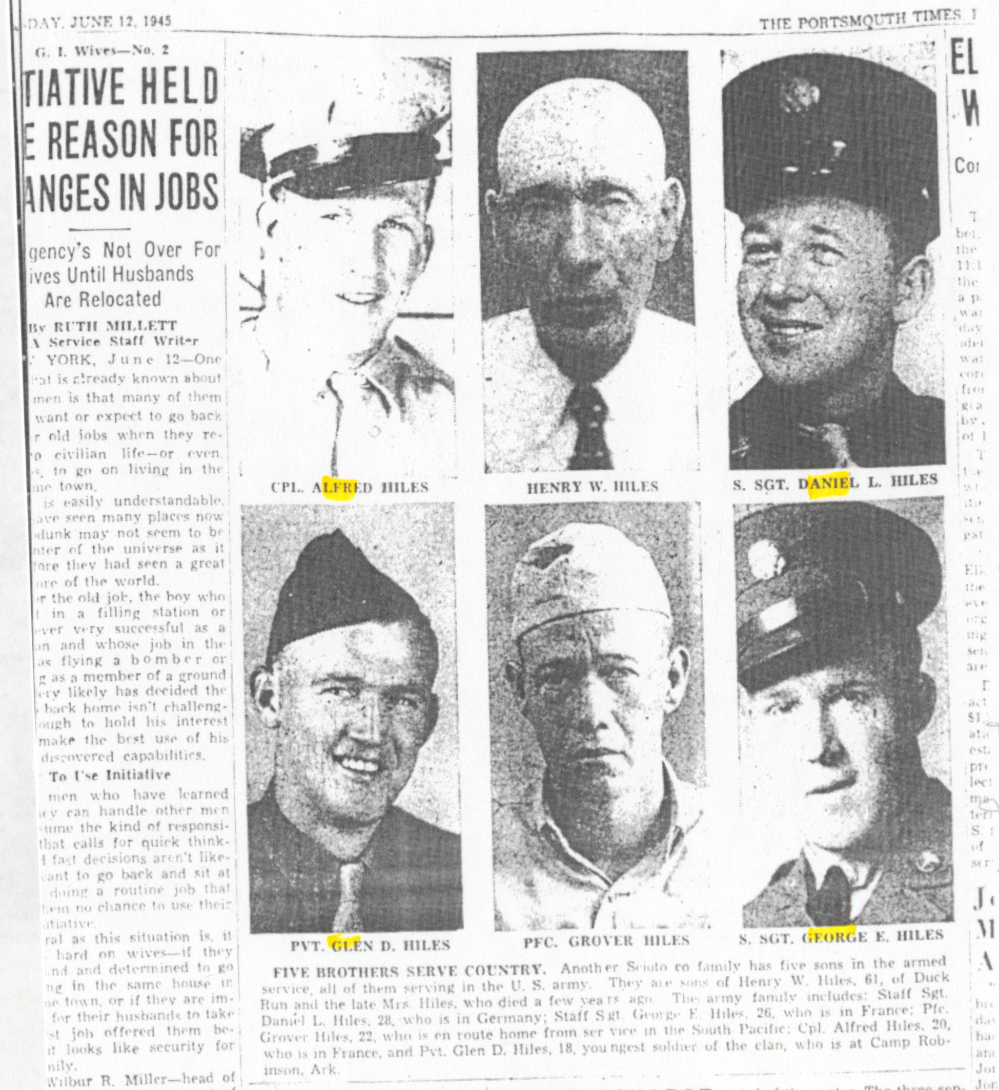 - A paper copy of a news article from June 12, 1945 about five brothers from Scioto County who served during World War II (1939-1945). CPL. Alfred Hiles, who was stationed in France; S. SGT. Daniel L. Hiles, who was stationed in Germany; PVT. Glen D. Hiles, who (at the time) was stationed at Camp Robinson, Arkansas; PFC. Grover Hiles, who was stationed in the South Pacific; S. SGT. George E. Hiles, who was stationed in France. Also included is Henry W. Hiles, their father.