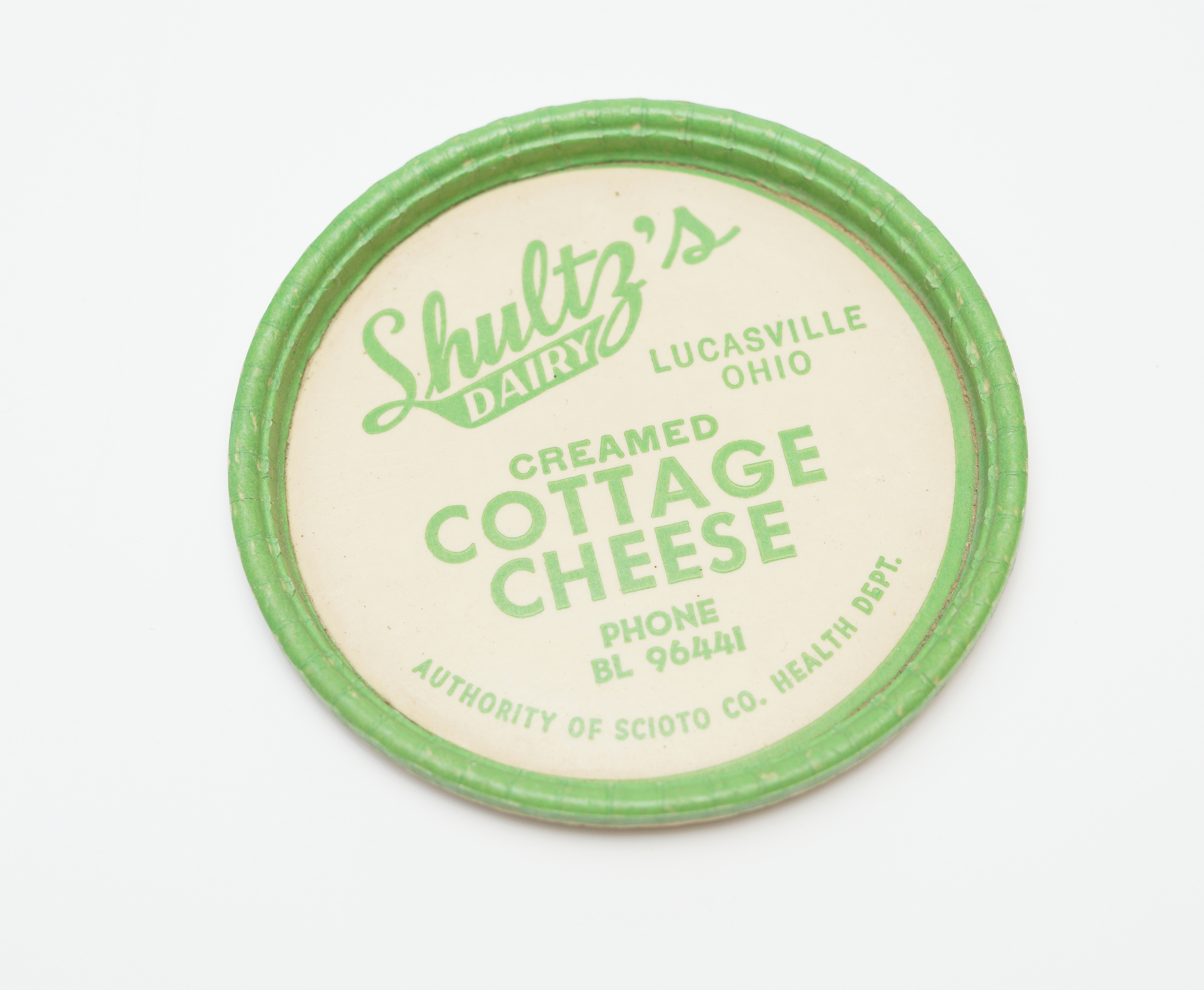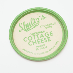 - An off-white with green outline and accents lid for creamed cottage cheese from Shultz's Dairy in Lucasville, Scioto County, Ohio. Text at the bottom says "Authority of Scioto Co. Health Dept."
