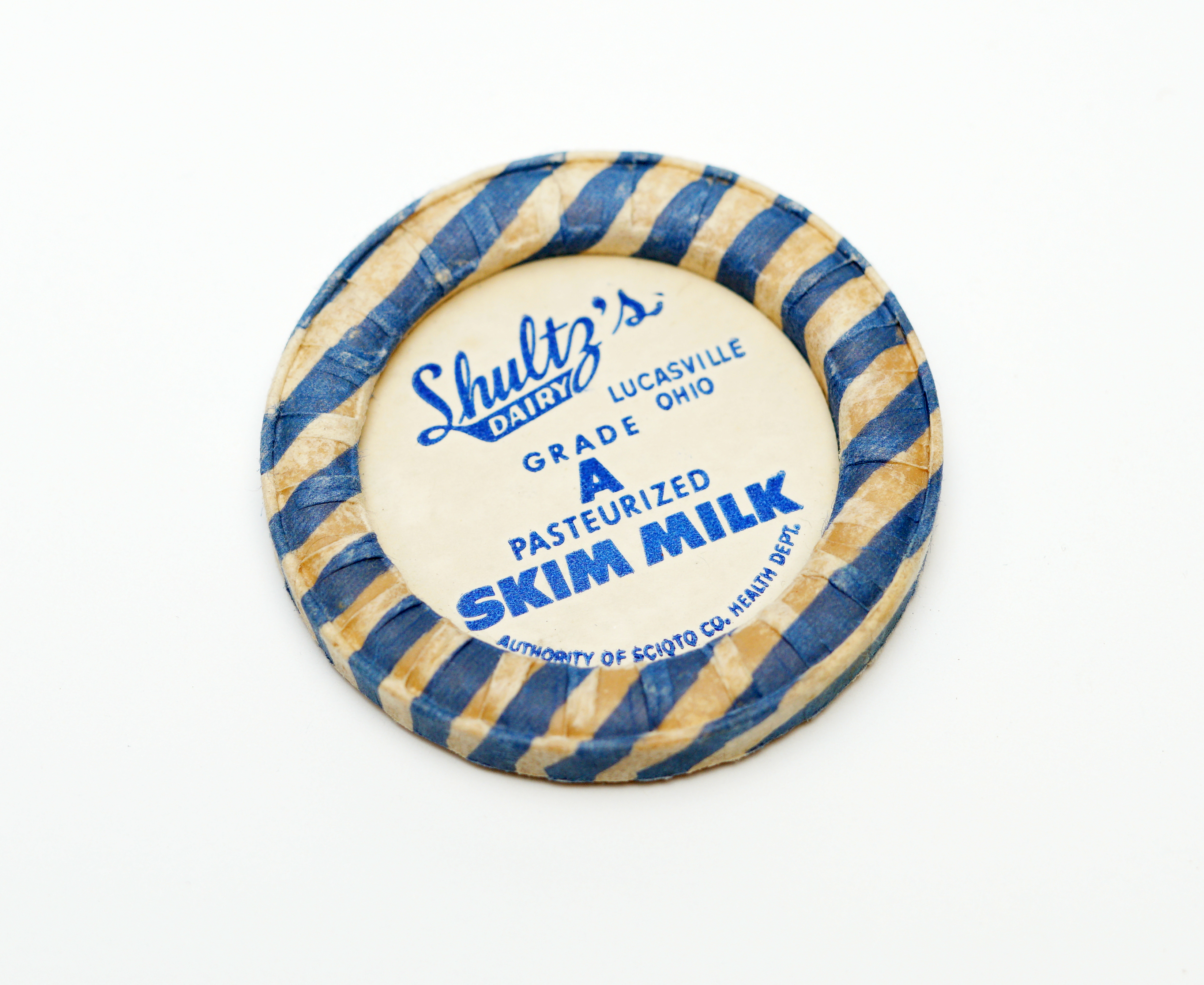 - An off-white w/ blue accents skim milk bottle lid from Shultz's Dairy in Lucasville, Scioto County, Ohio