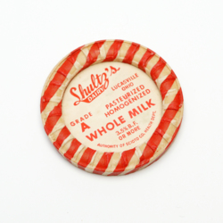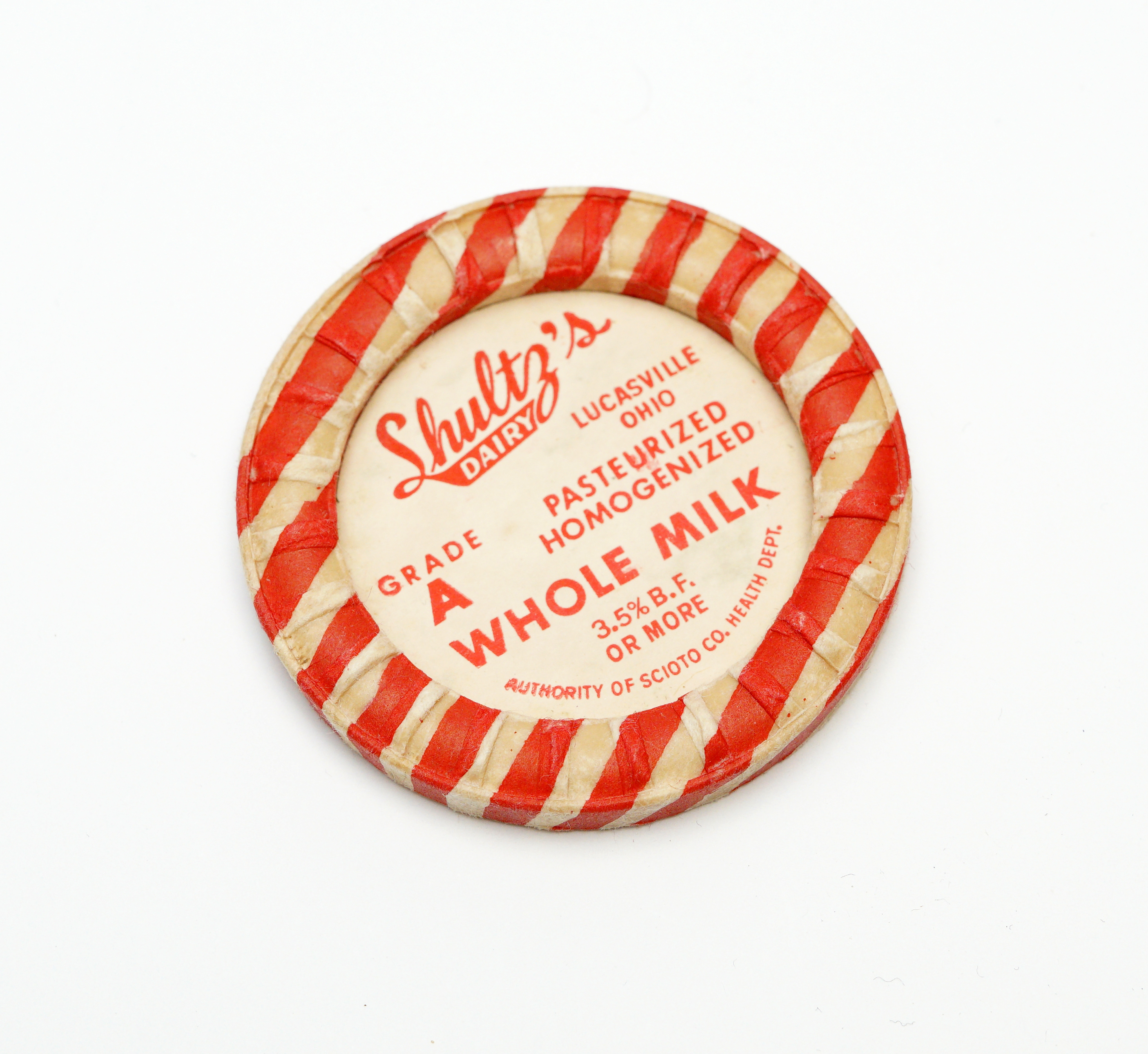 - An off white w/ red accents whole milk bottle lid from Shultz's Dairy in Lucasville, Scioto County, Ohio.