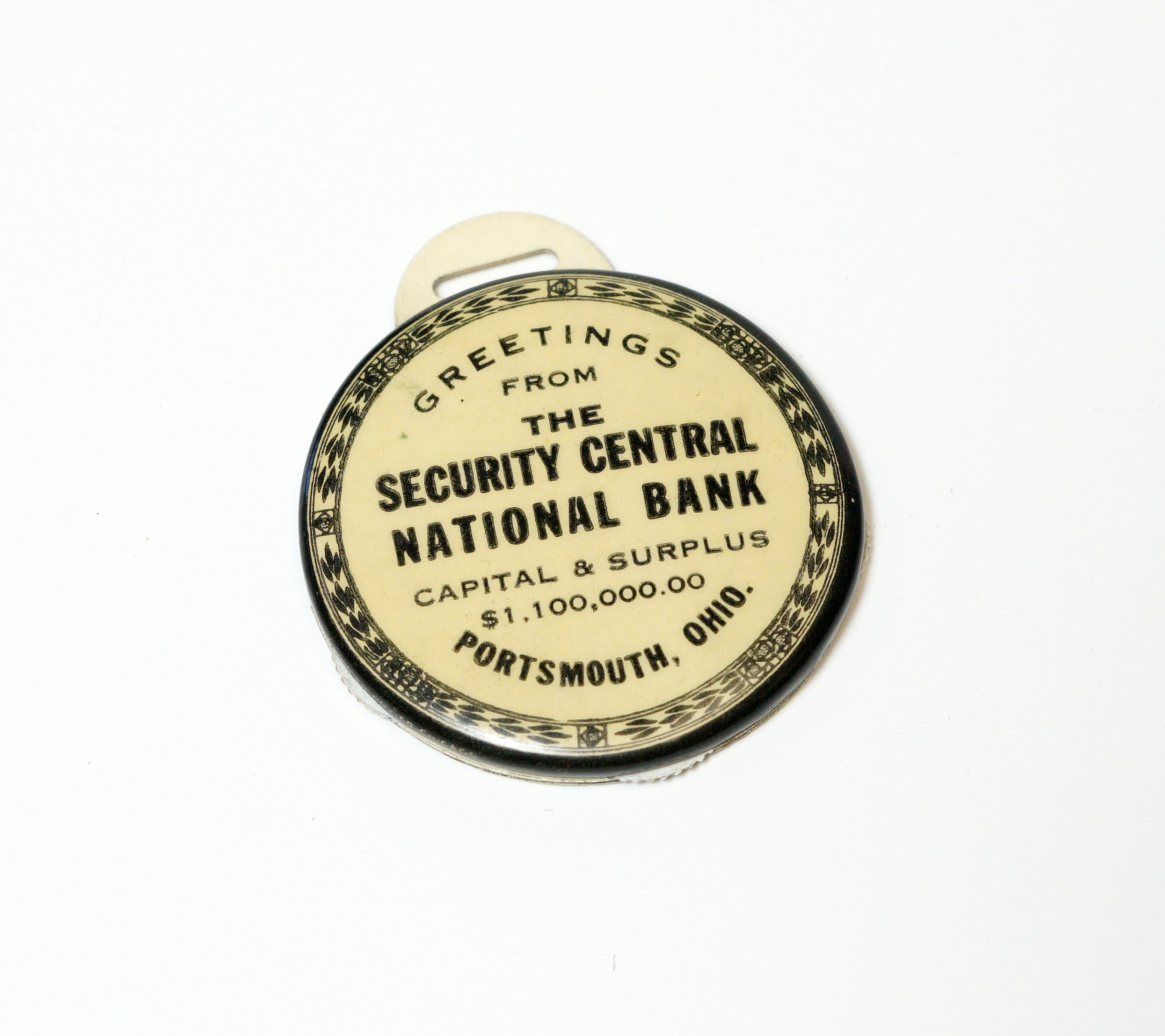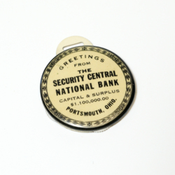- An off-white with black lettering tag for The Security Central National Bank. Writing says "Greetings from the Security Central National Bank, Capital and Surplus $1,100,000.00, Portsmouth, Ohio" On the back is a colored baseball game where you can change the inning, runs, and hits with a dial. The Security Central National Bank was at 825 Gallia Street and opened June 30, 1930. Above the entrance it originally said the "Security Bank". It is now the home of the Southern Ohio Museum and Culture Center on Gallia Steet.