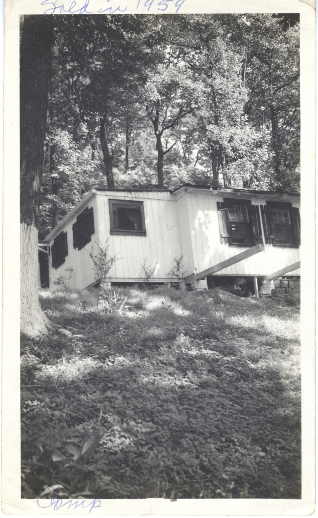 - Black and white photo image of a house on Thomas Ave. Written on back in pencil: "Our camp bought in 1935. Sold in 1959 to Mr. Smith. He removed the trees. House is still standing." Ink on front: "Sold in 1959" "Camp"