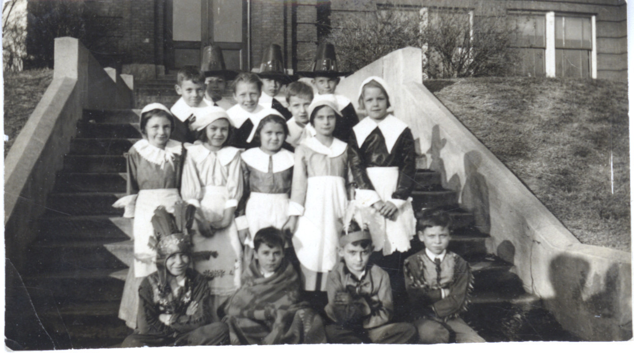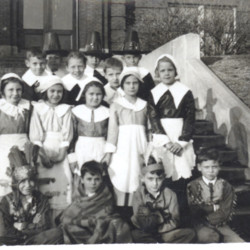 - Black and white photo of students in costume for a Thanksgiving play. Sitting on front steps.