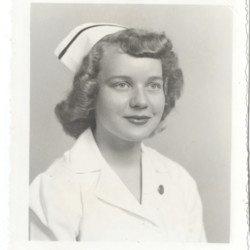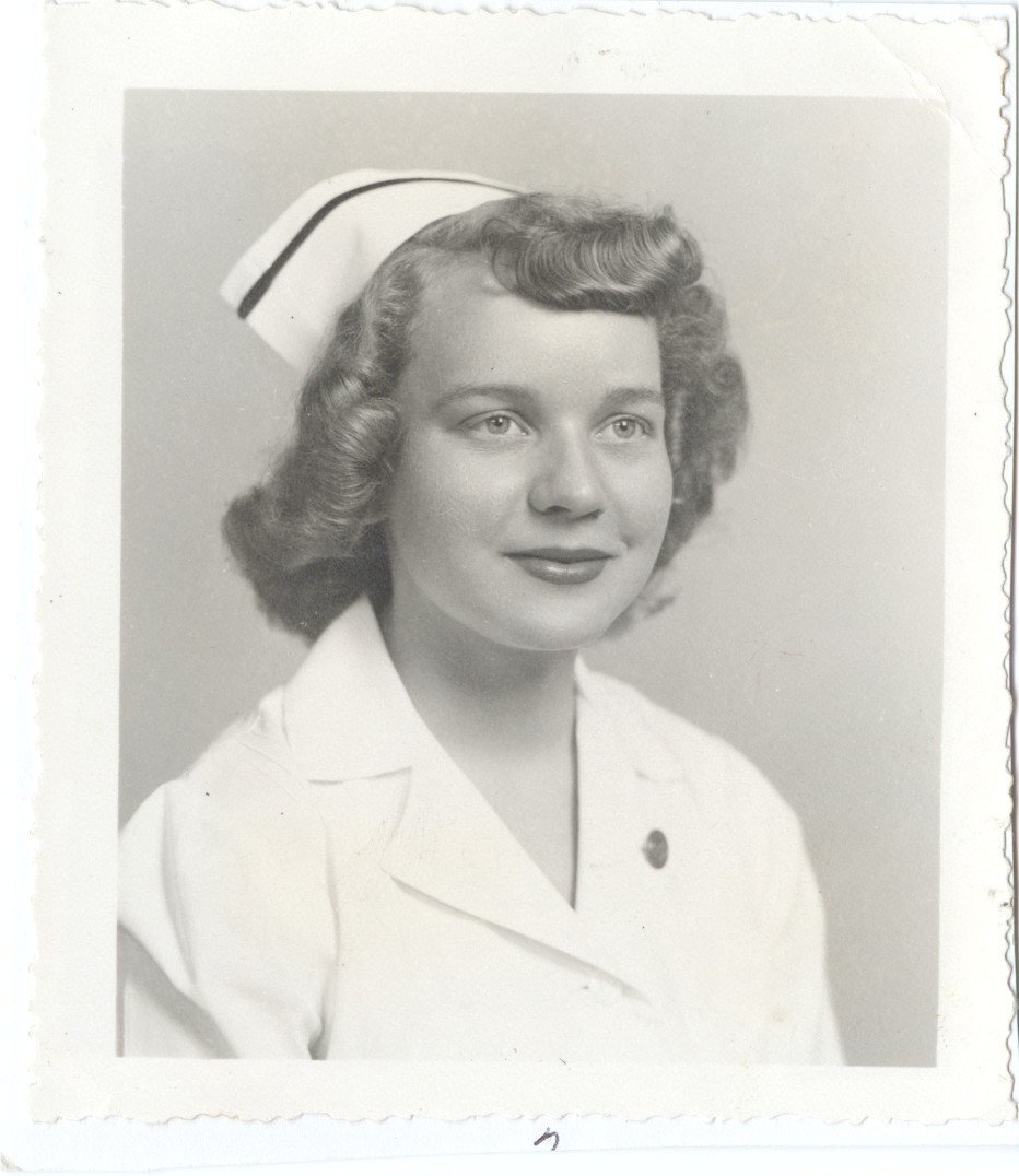 - Black and white portrait photo of Margie Fink, Class of 1950 Mercy Hospital School of Nursing. Photo attatched to white cardstock.