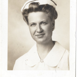 - Sepia-toned, glossy portrait photo of Mary Puthoff, Class of 1944 Mercy Hospital School of Nursing.