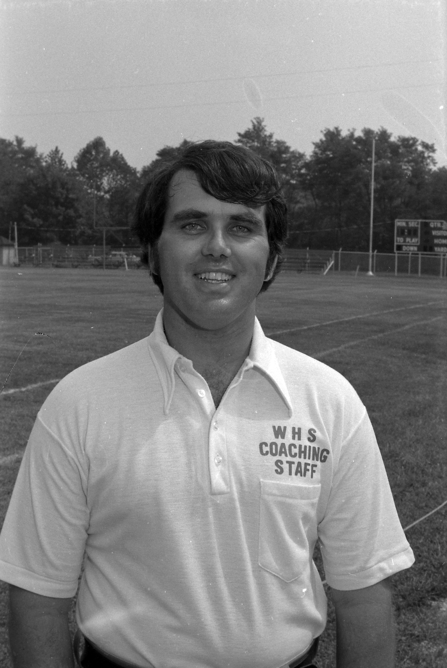 - Black and white photo negative of the 1977 Wheelersburg High School Coach, Bob Schwamburger.