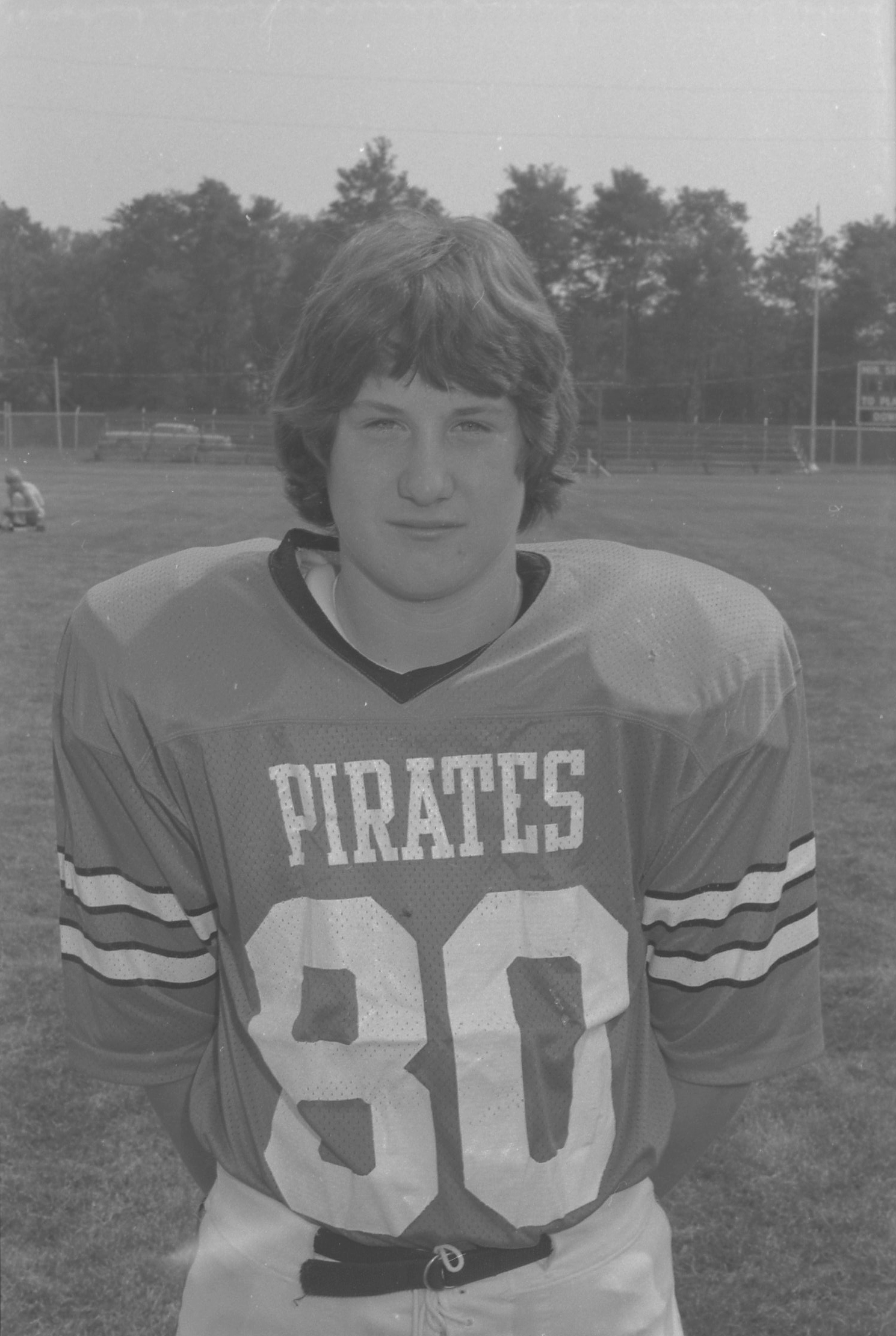 - Black and white photo negative of 1977 Wheelersburg High School Football player, #80 Ron Conley.