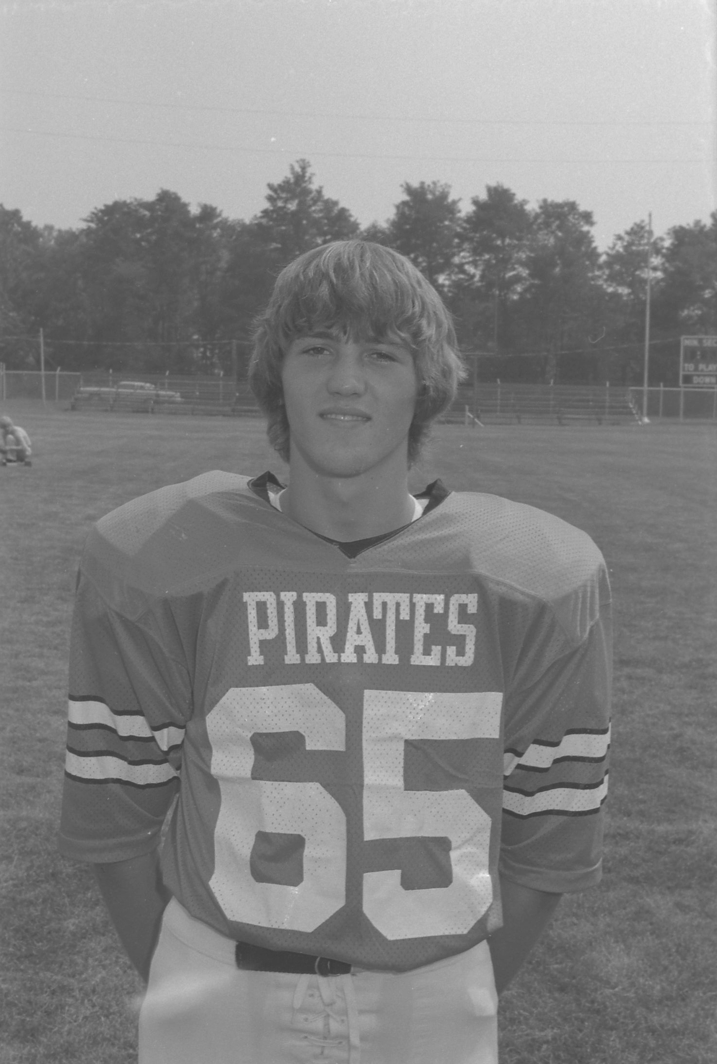 - Black and white photo negative of 1977 Wheelersburg High School Football Player, #65 John Conley.