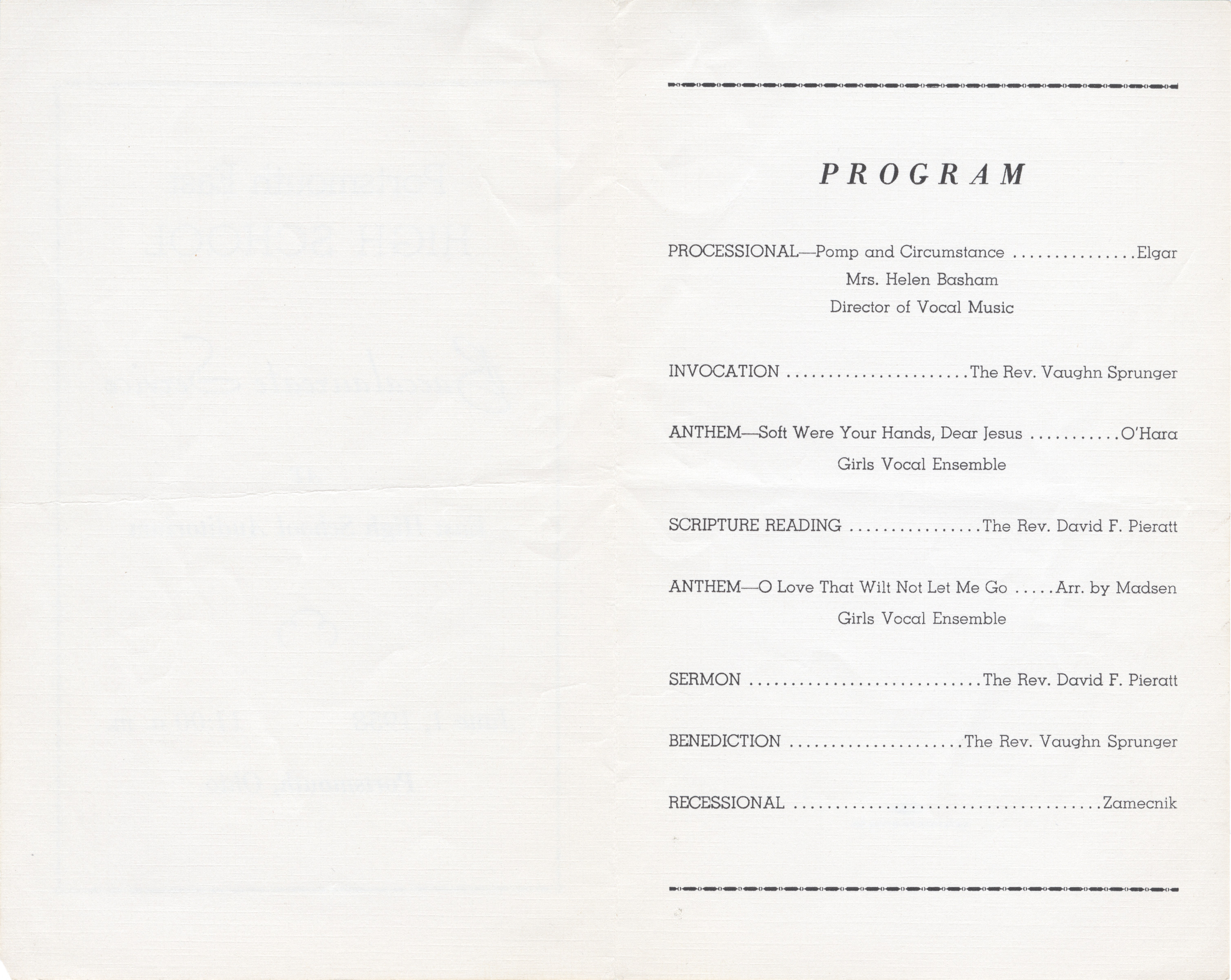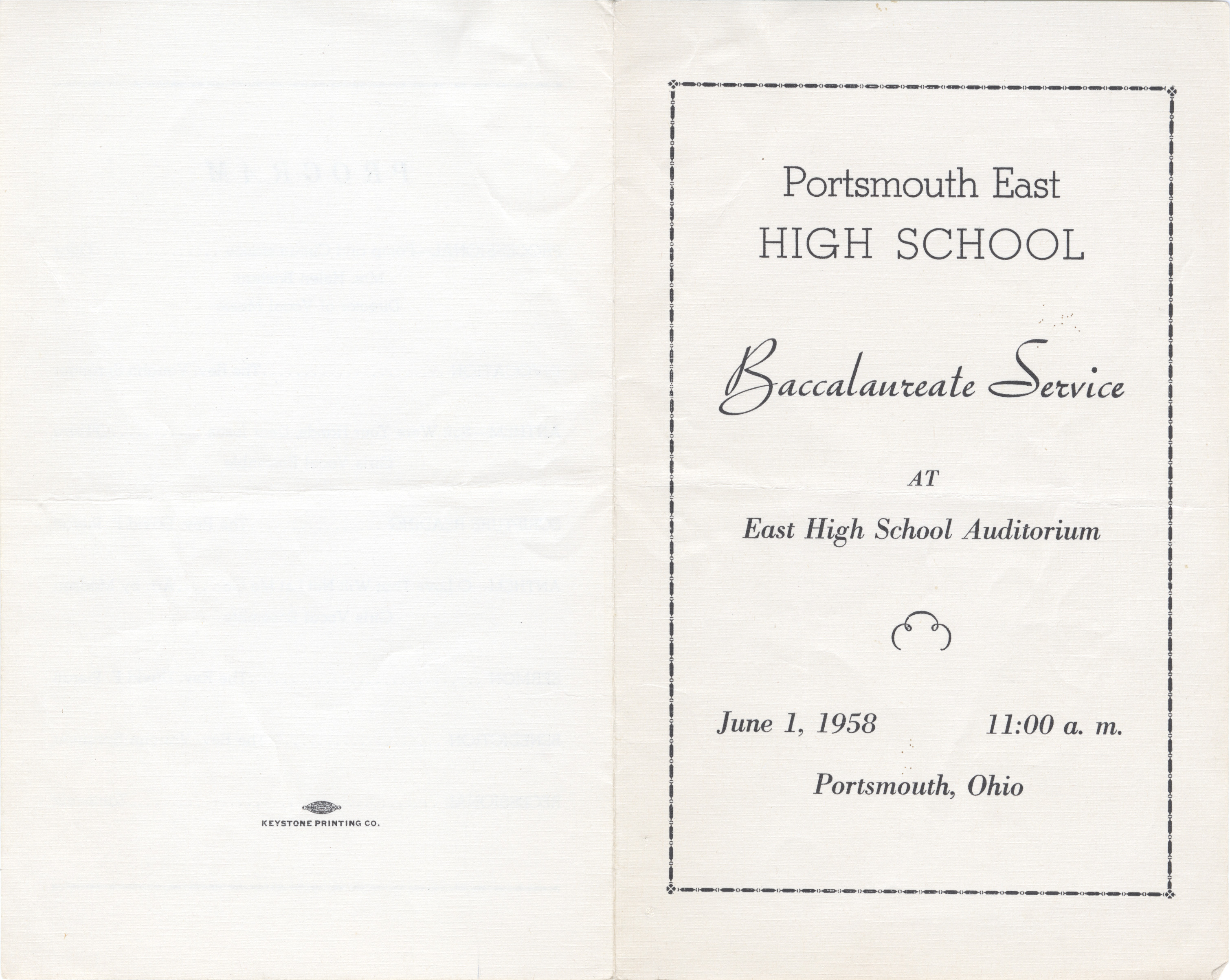 - Aged, off-white program of the Baccalaureate Service at the East High School Auditorium on June 11, 1958. Black print. Program service inside.