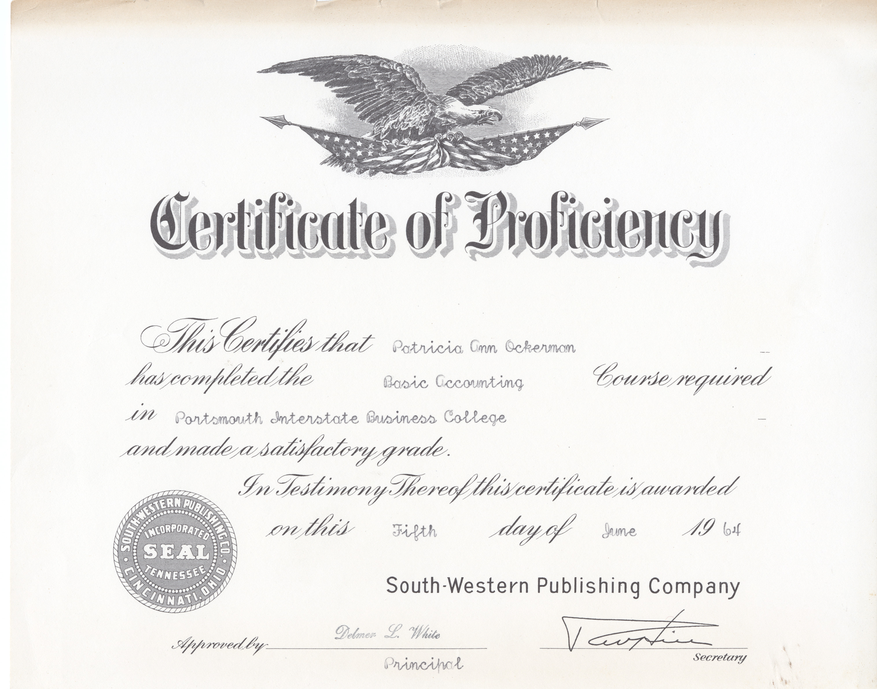 - Aged, cardstock-like certificate from the Portsmouth Interstate Business College. Certificate of Proficiency addressed to Patricia Ann Ockerman on June 5th, 1964.