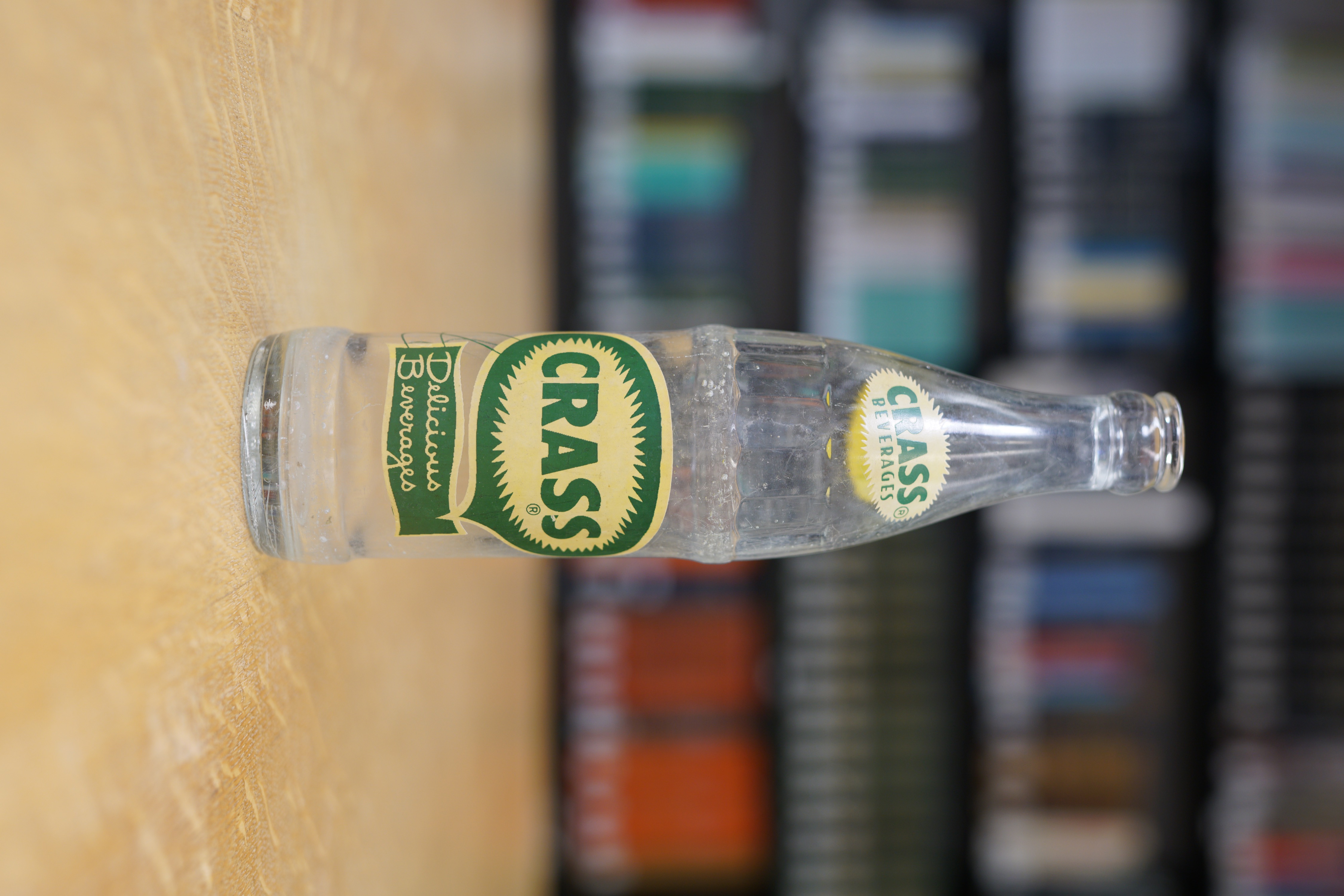 - Clear glass bottle, yellow and green painted labeling with "Talking Bubble" design: "Crass Delicious Beverages" and "Crass Beverages." On back in green lettering: Property of Coca-Cola Bottling Co., Inc., Portsmouth, Ohio." Content and fluid ounces (12 FL OZ).