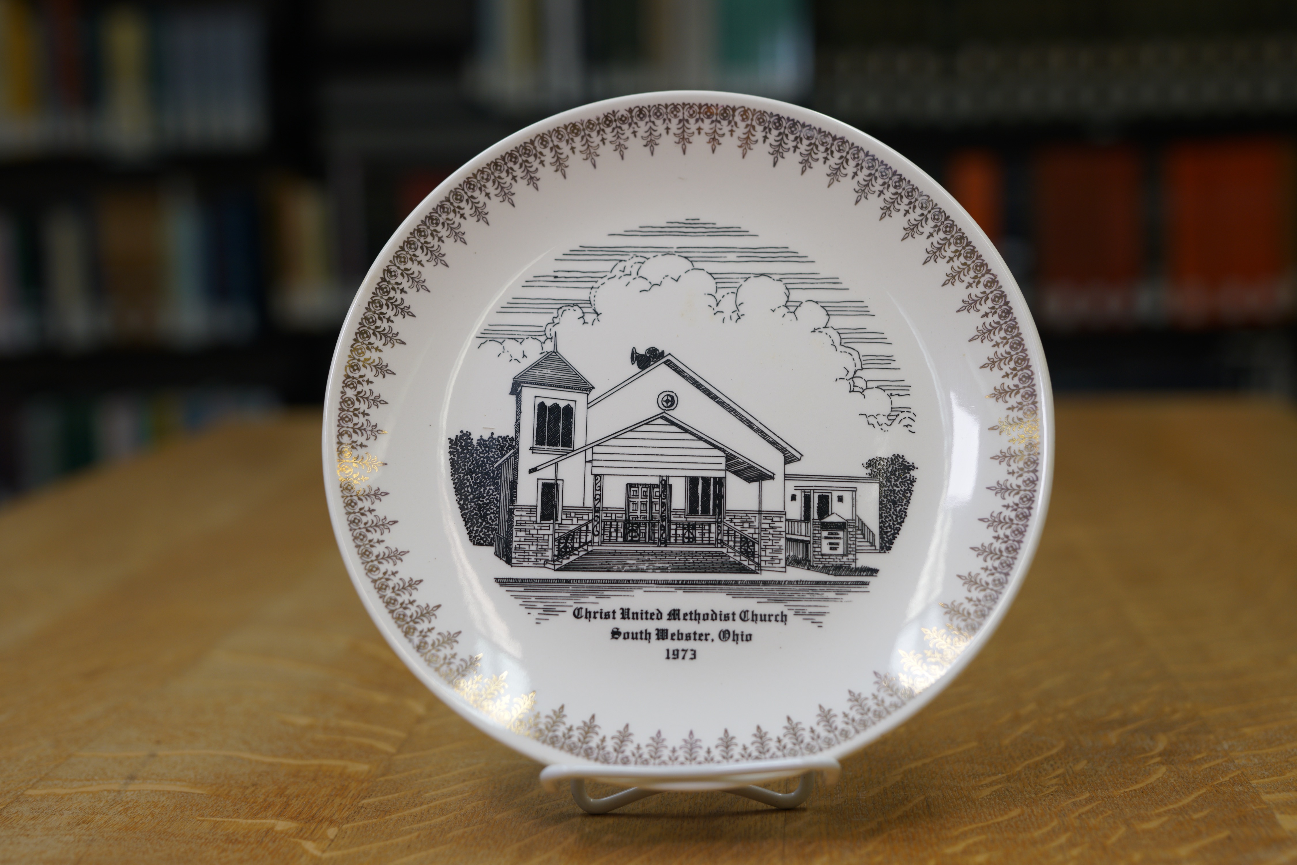 - White ceramic plate with black print with gold trimming and an illustration of Christ United Methodist Church in South Webster.