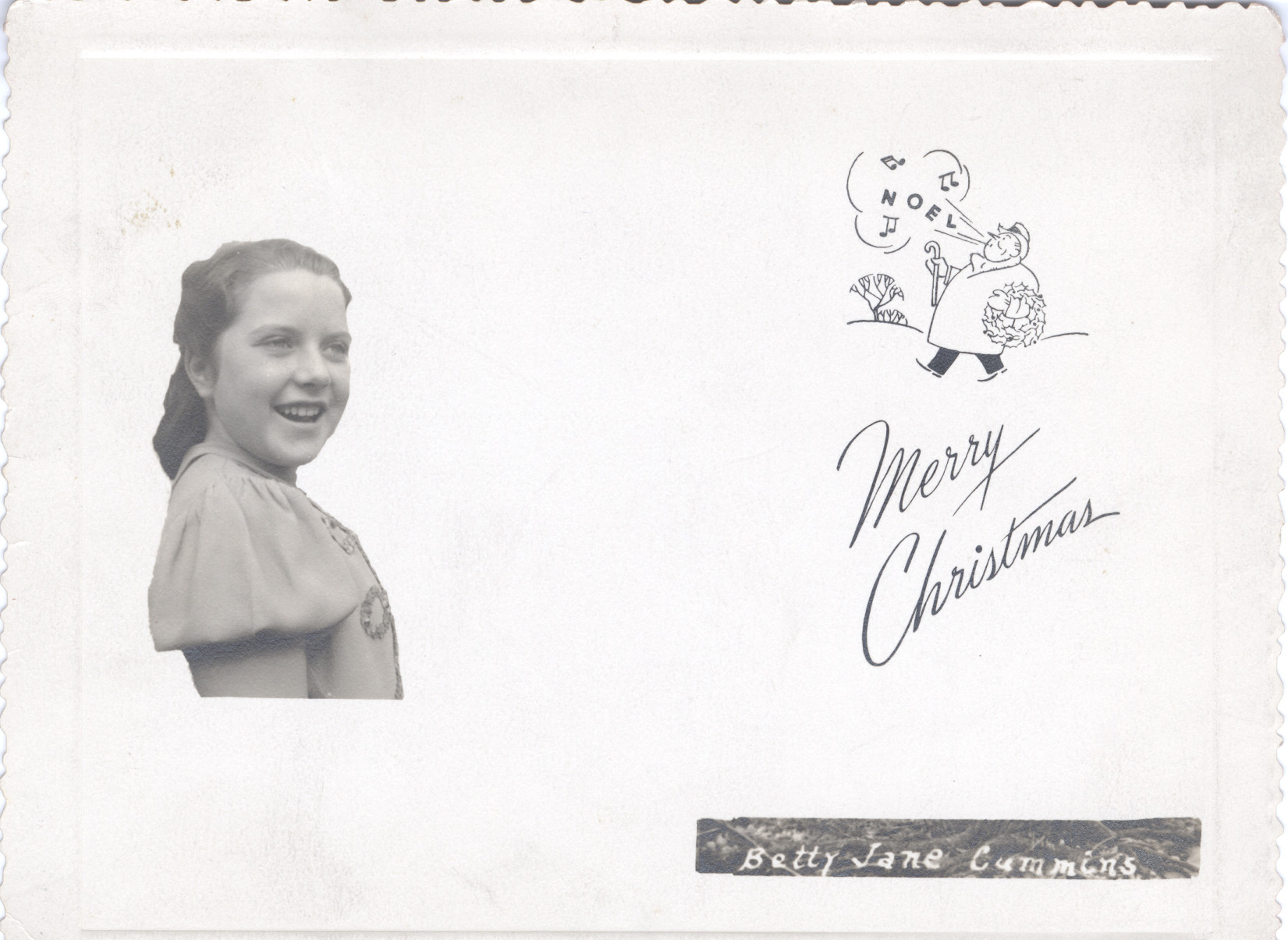 - White card with scalloped edges, black fonts, illustrations and black and white photo of Betty Jane Cummins. Personalized Christmas card. Just last name "Cummins" on back.