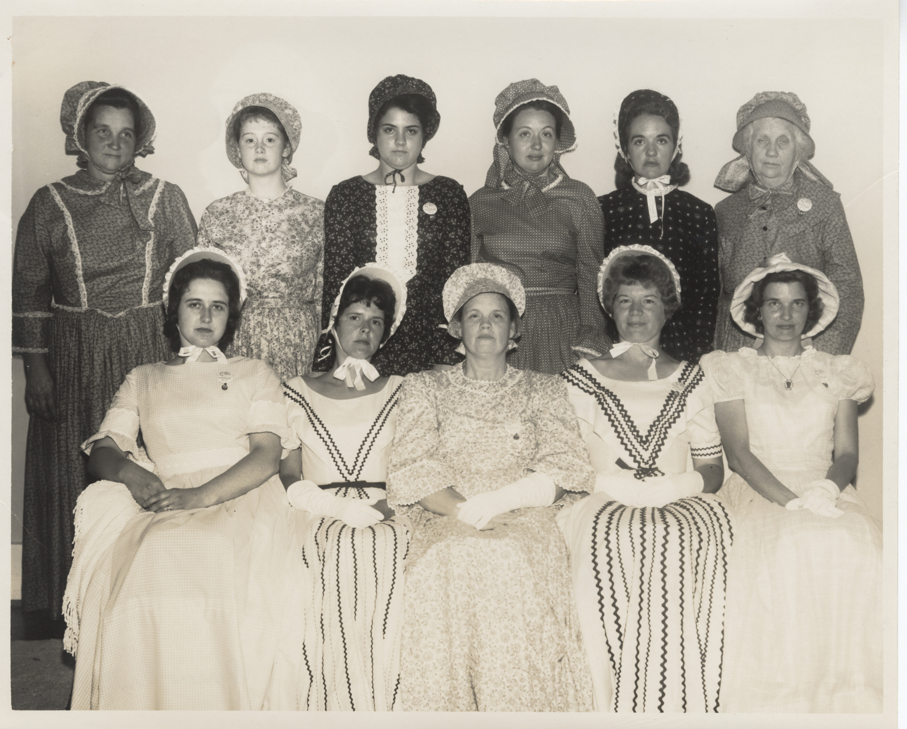 - Black and white group photo of ladies participating in the Lady Belles Sesquicentennial. Noted on the back as: "Parson's Pretty Pollies" but no names provided.