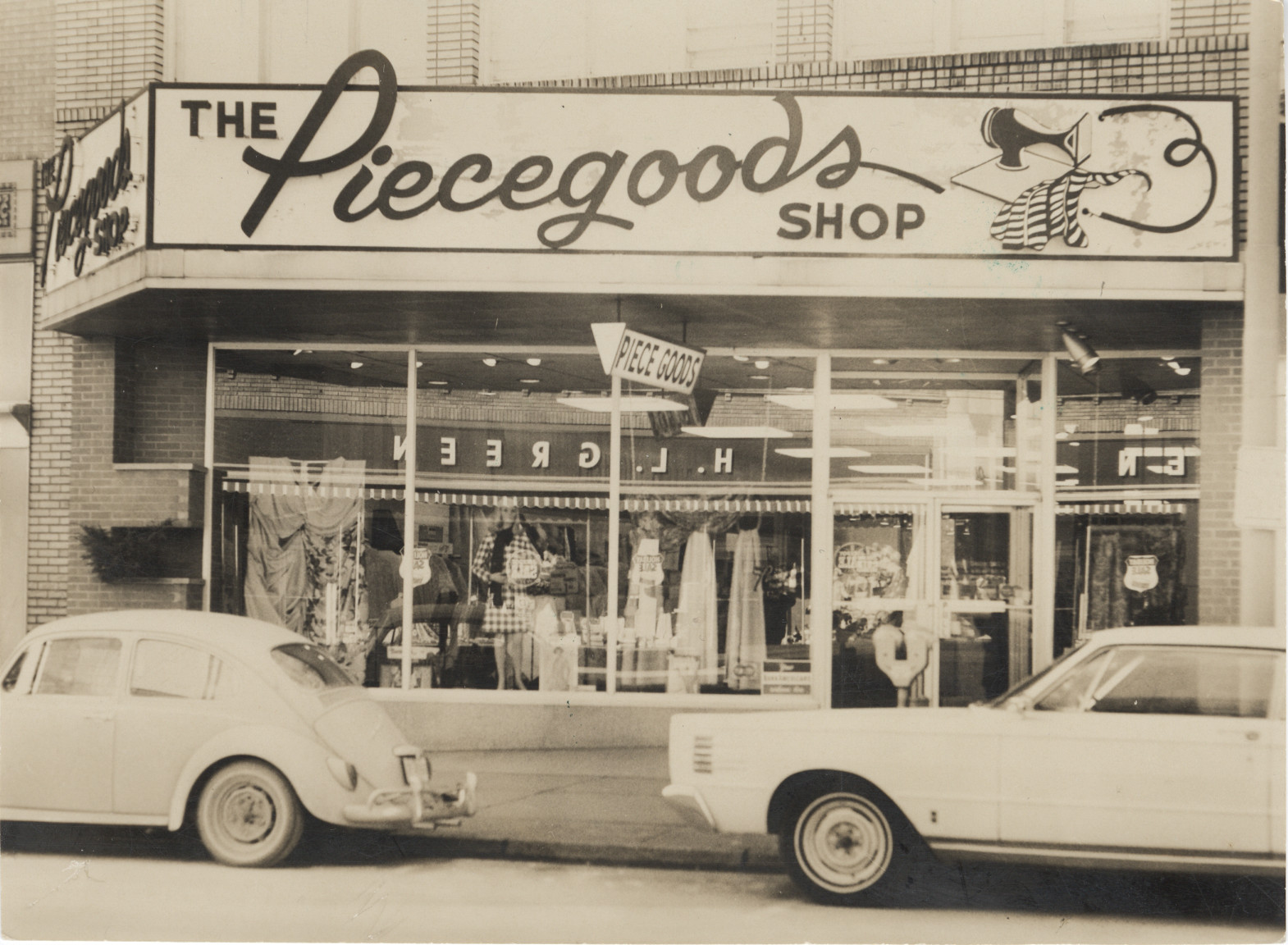 - Black and white photo image of the building in 1970. Window shop reflection of H.L. Green across the street. The building was built in 1924 to house Bragdon's. When they closed in 1967, Piece Goods moved in. Piece Goods moved to New Boston in 1992, then closed in 1999.