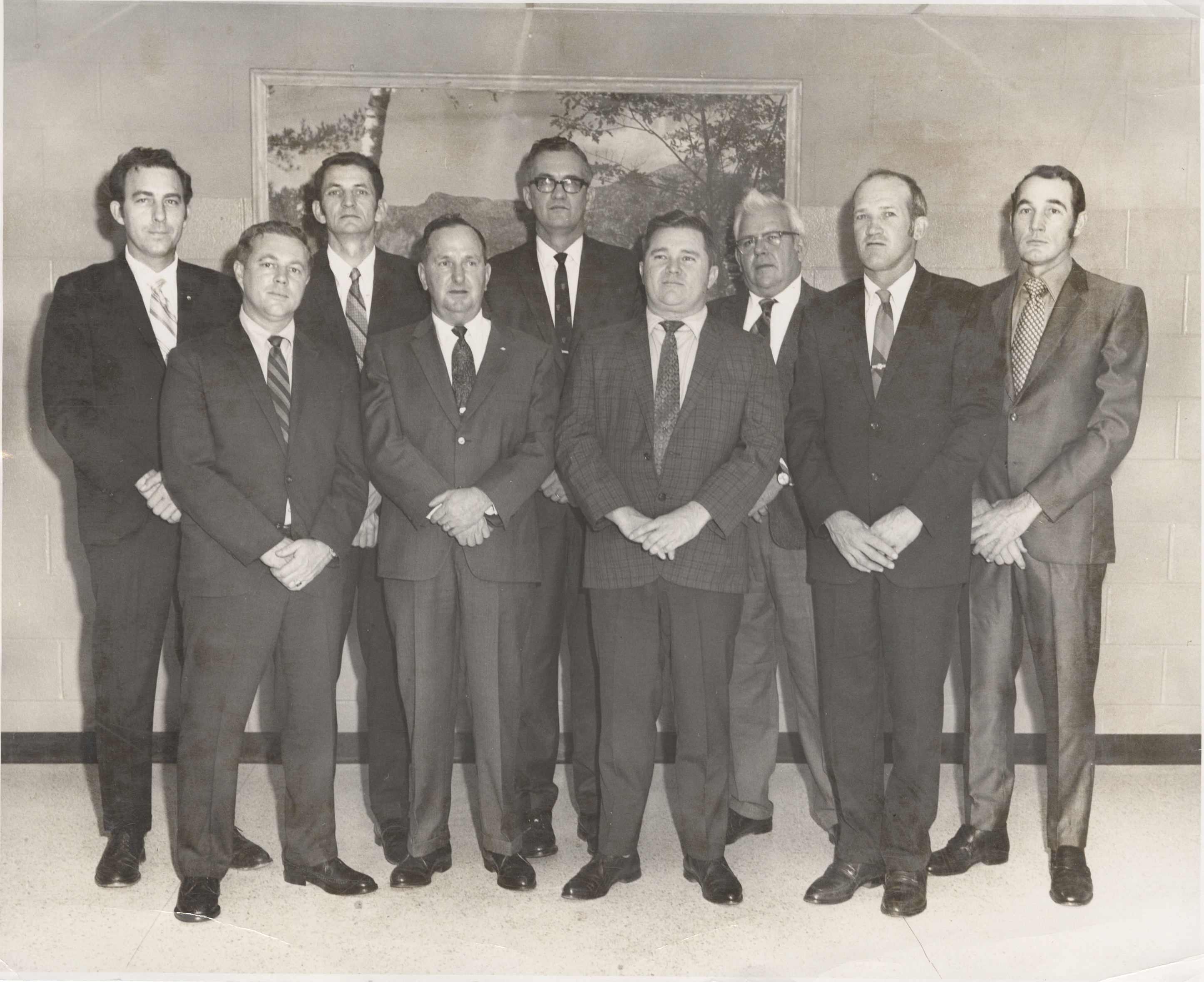 - Black and white photo image of the West Portsmouth Business Club. Not all identified. Written in black ink on back: "Front row far left Jim Thompson, 2nd from left Orville Shaw; front row far right Leo Simon, 3rd from right Truman Throckmorton; Back row 2nd from left Leonard "Lum" Olier, 3rd from left (middle) Louis Shy, next Cleo (Bud) Wiltshire; Back row far right Elmo Smalley"