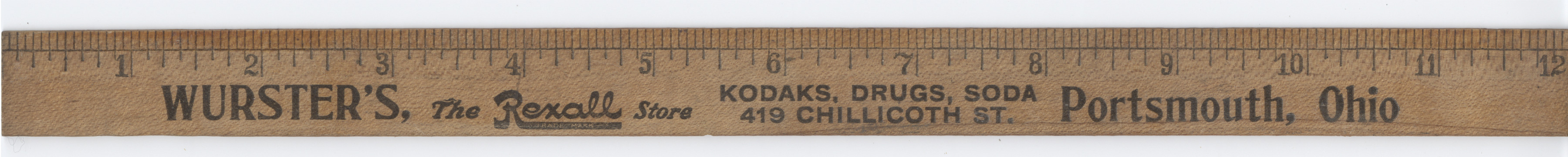 - Wooden 12 inch ruler with black printer. Wurster's, The Rexall Store, was located at 419 Chillicothe Street.