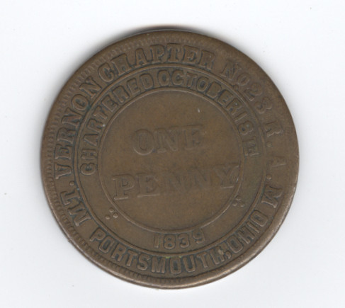 - Bronzed, light-weight token for the Mt. Vernon Masonic Chapter. It was chartered on October 18th, 1839. Token was worth one penny. Slightly worn.